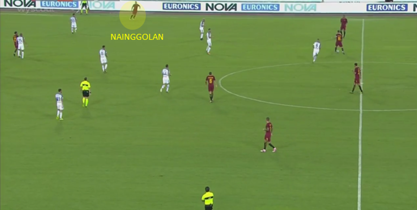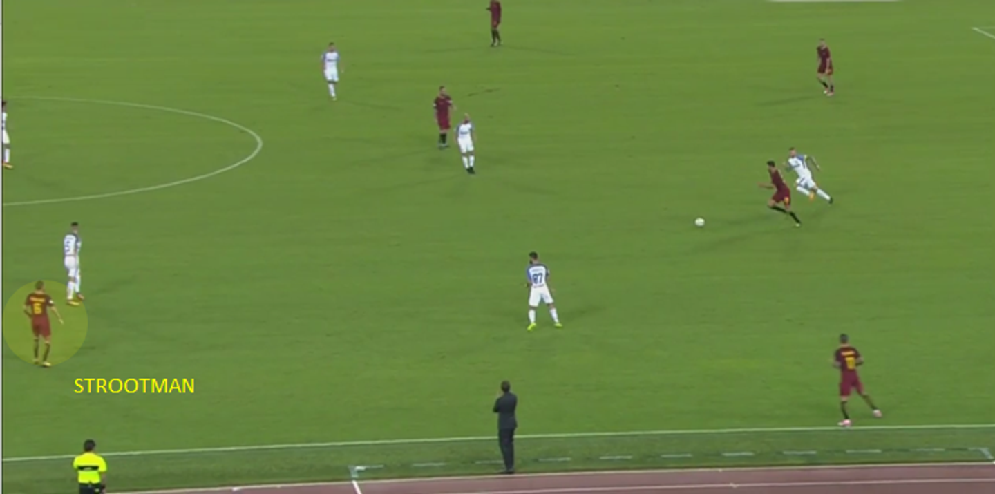 Nainggolan e Strootman costretti a ricevere sulla linea laterale, con le spalle alla porta: come disperdere il talento di due dei migliori centrocampisti della Serie A (anche se Nainggolan giocherebbe bene anche da portiere).