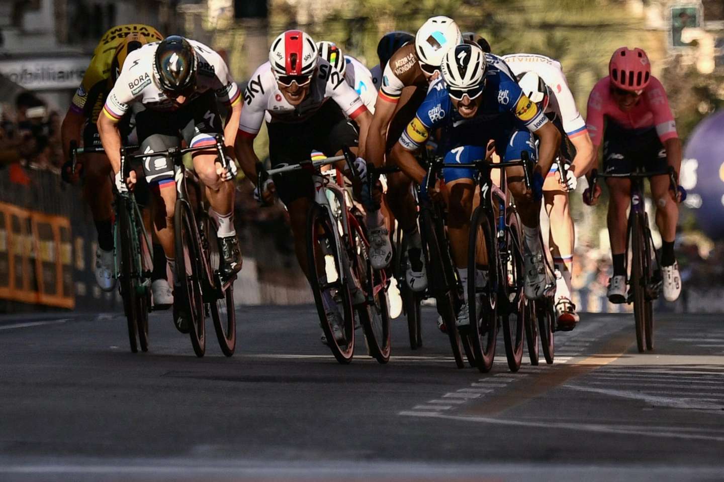 Davanti però, nonostante l’azione decisa di Alaphilippe, sono rimaste alcune ruote veloci pericolose: Peter Sagan su tutti, che la Sanremo l’ha sempre e solo sfiorata; Matteo Trentin, il campione europeo in carica ed eterna promessa del ciclismo italiano; Michał Kwiatkowski, che nel 2017 in una situazione analoga riuscì a beffare allo sprint proprio Sagan e un giovane Alaphilippe.