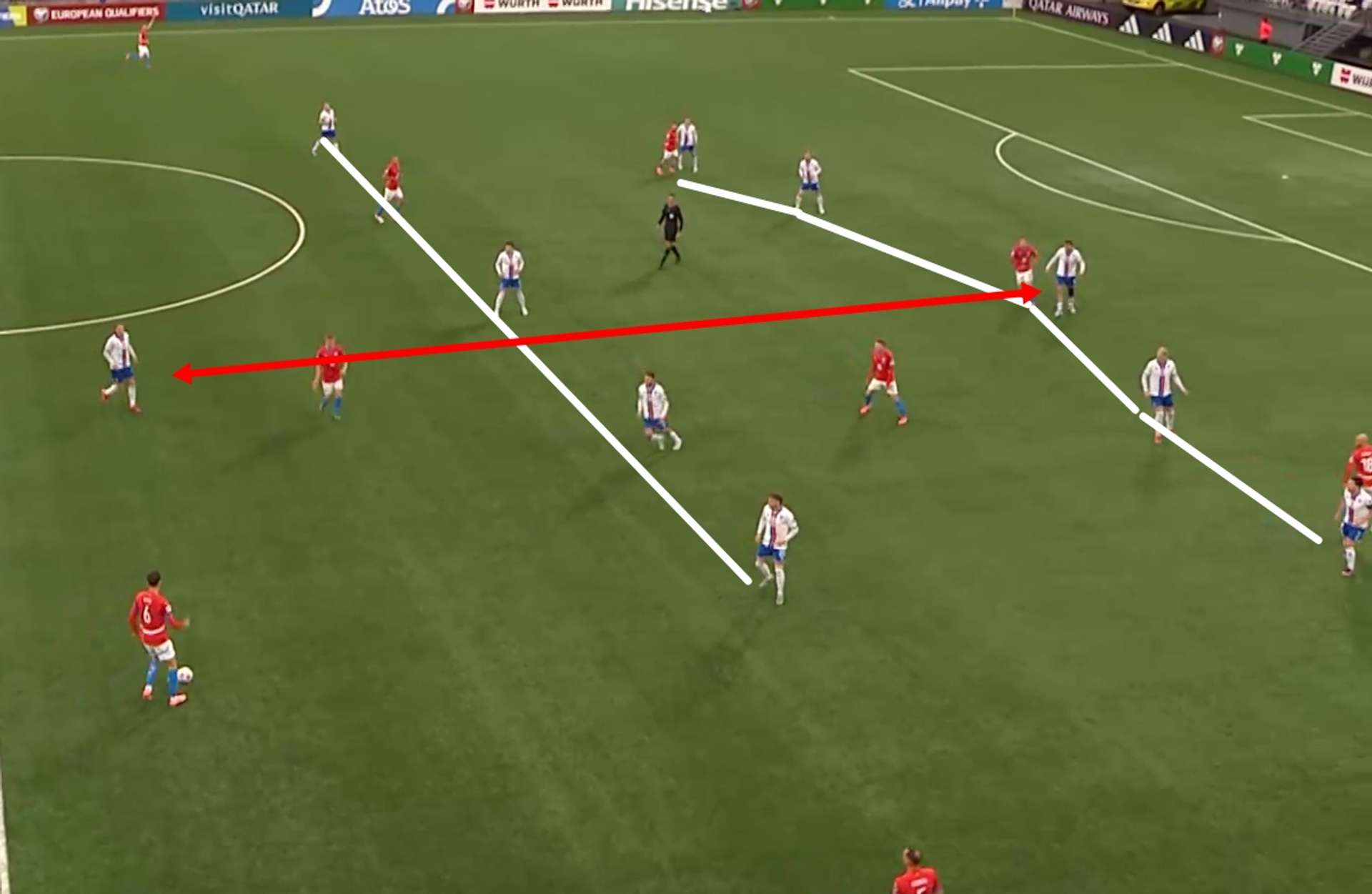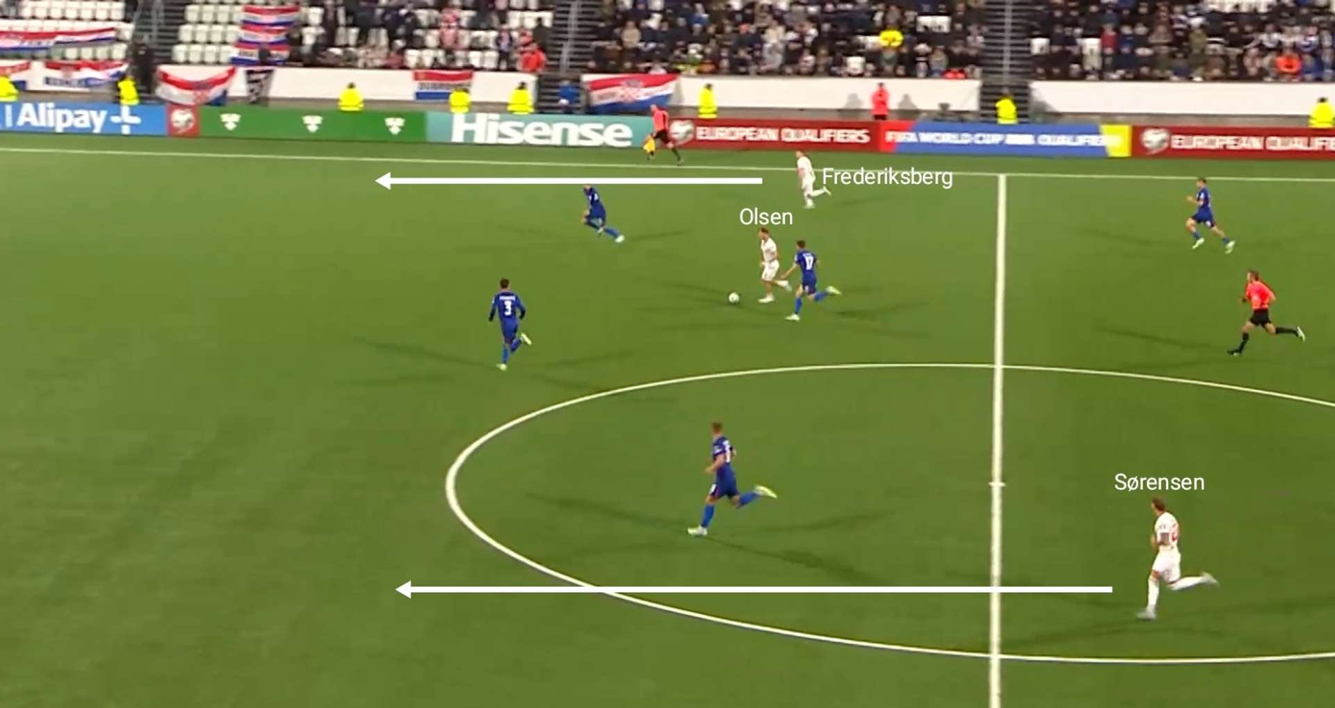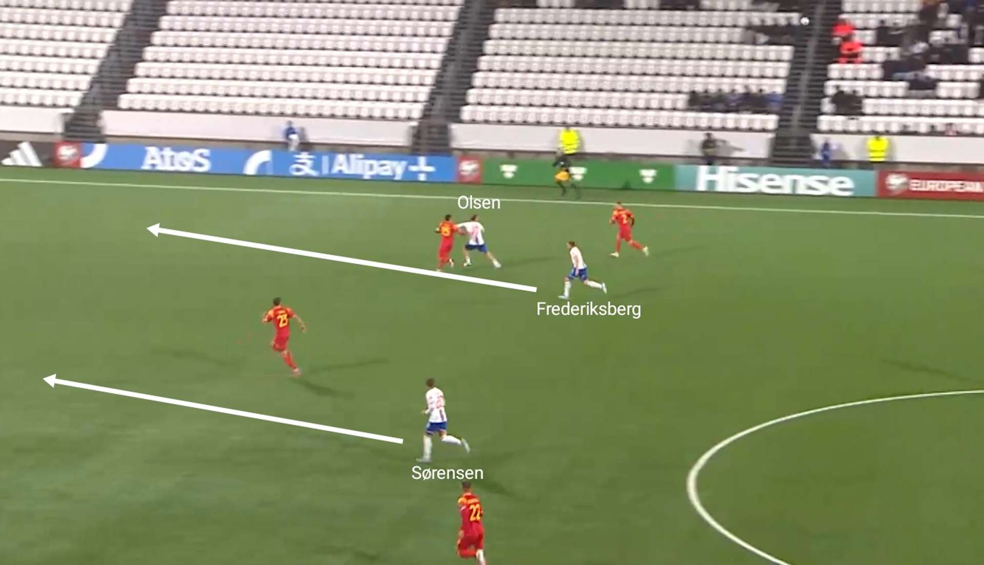 Il primo gol contro Montenegro, per dire, si vede che è un movimento codificato, pensato per attaccare lo spazio più rapidamente possibile. Da un lancio lungo, Olsen protegge bene con il corpo e tocca di prima, impedendo al difensore di intervenire. A seguire l’azione ci sono Sørensen - che occupa il corridoio centrale - e Frederiksberg, che controlla e serve il suo compagno a rimorchio. Il controllo è efficace, nonostante la palla sia leggermente arretrata, e la giocata sfrutta una difesa montenegrina troppo svagata che lascia all'esterno la libertà di crearsi lo spazio per la conclusione sul primo palo.