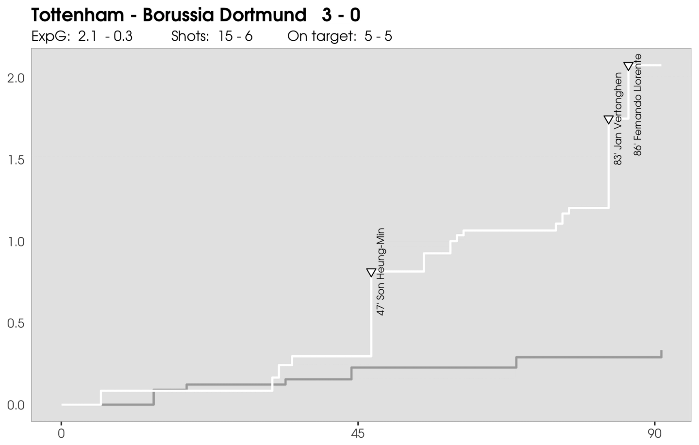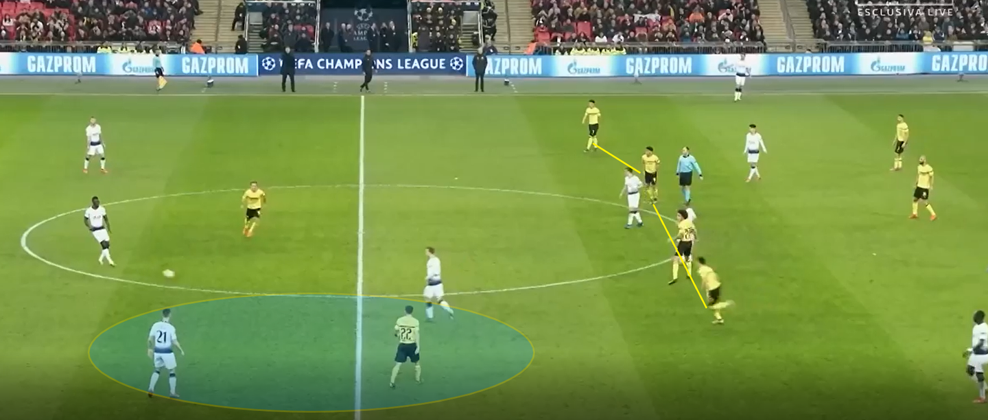 Entrambe le mosse di Pochettino hanno sbilanciato il piano tattico della partita dalla parte degli “Spurs”. La pressione più alta dei due esterni ha reso meno agevole la costruzione bassa del Borussia Dortmund, togliendo la possibilità agli uomini di Favre di consolidare il possesso, che, nonostante il punteggio sfavorevole, nella ripresa è stato inferiore rispetto a quello del primo tempo. Il 3-5-2 ha anche mantenuto la medesima protezione del centro e agevolato le mezzali nei raddoppi sulle ali Sancho e Pulisic.