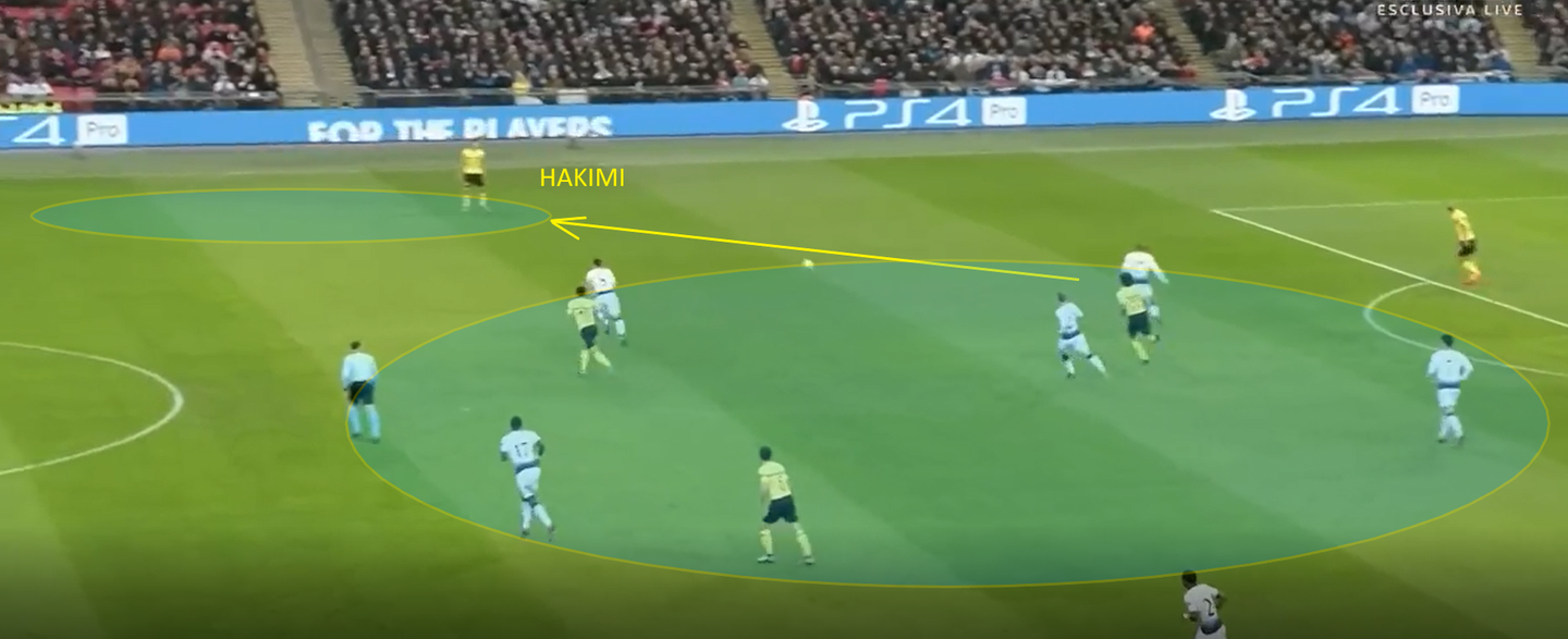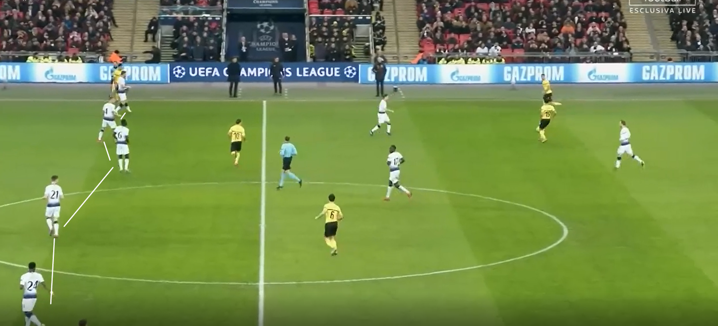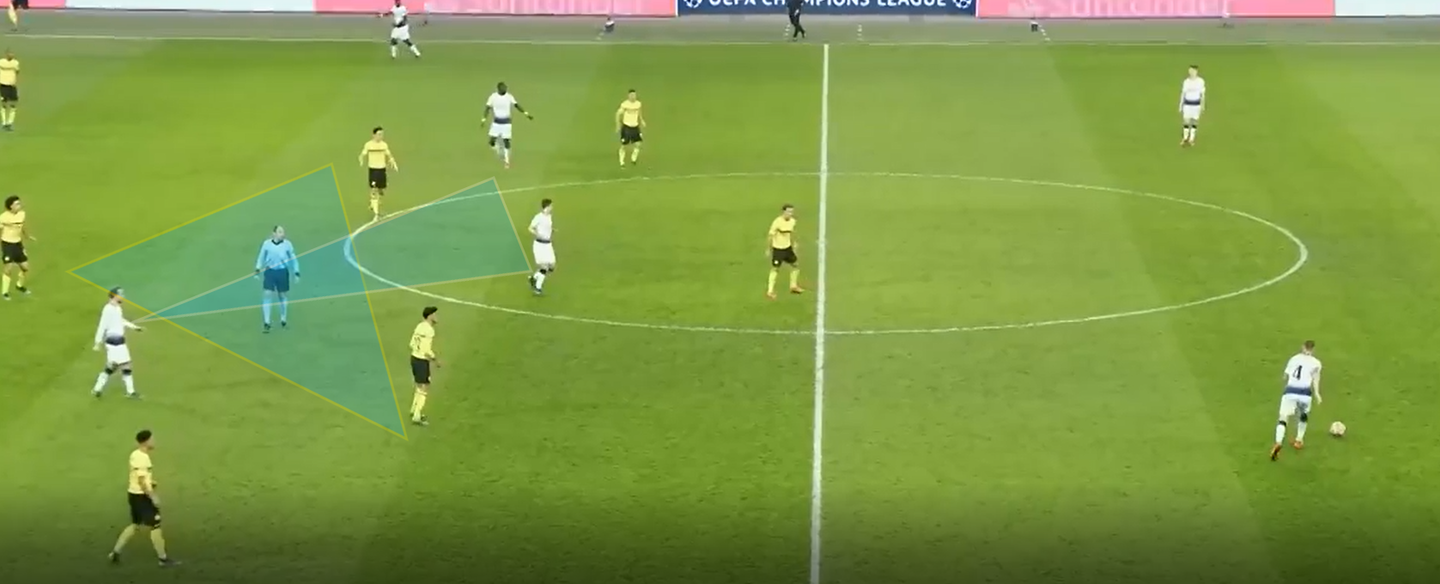 Se da un lato la prudenza di Pochettino ha garantito nel primo tempo un’adeguata prevenzione dei rischi, grazie all’ottima protezione del centro del campo e al costante raddoppio su Pulisic e Sancho, dall’altro ha lasciato al Borussia Dortmund la possibilità di risalire il campo usando le fasce, dove, dopo la ricezione dei terzini avversari, i due esterni di Pochettino sono rimasti talvolta presi in mezzo proprio tra il terzino e l’esterno alto di riferimento.