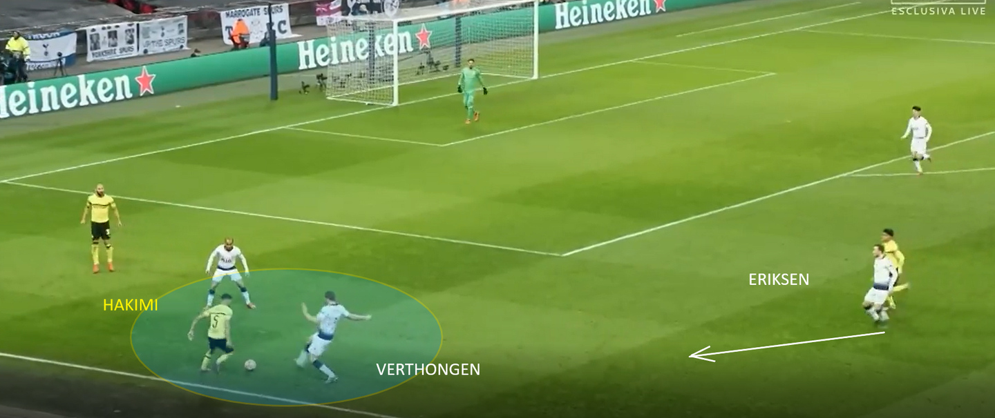 Dopo appena un minuto dall’inizio del secondo tempo, la strategia ha dato i suoi frutti. Verthongen si è infatti alzato su Hakimi costringendolo a una soluzione complessa in tunnel per uscire dalla pressione. Il pallone è stato però recuperato da Eriksen e la ripartenza corta che ne è seguita ha portato al gol di Son.