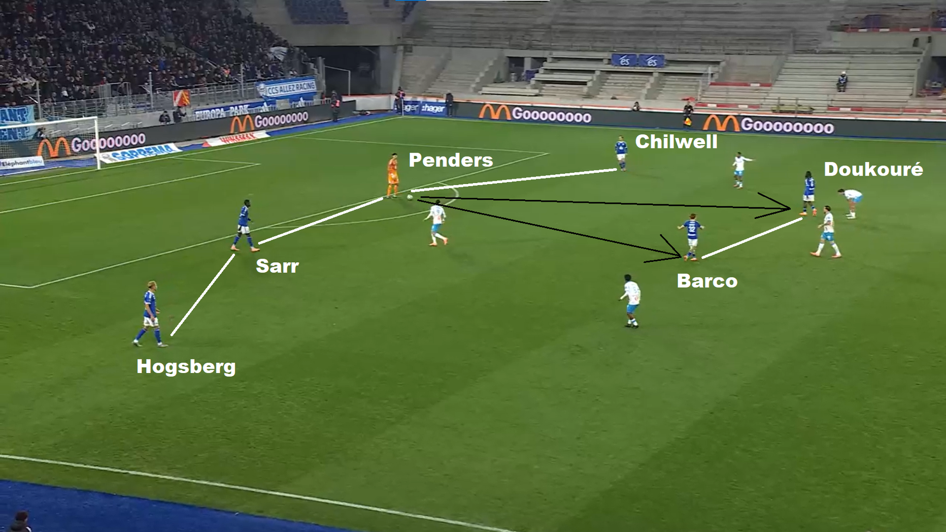 Nell’immagine sotto vediamo la tipica prima costruzione 4+2 dello Strasburgo, con il portiere Penders sulla linea dei difensori, il terzino destro Guéla Doué (fratello di Désiré) fuori dall’inquadratura a fissare l’ampiezza e quello dall’altro lato Chilwell a tenere la posizione.