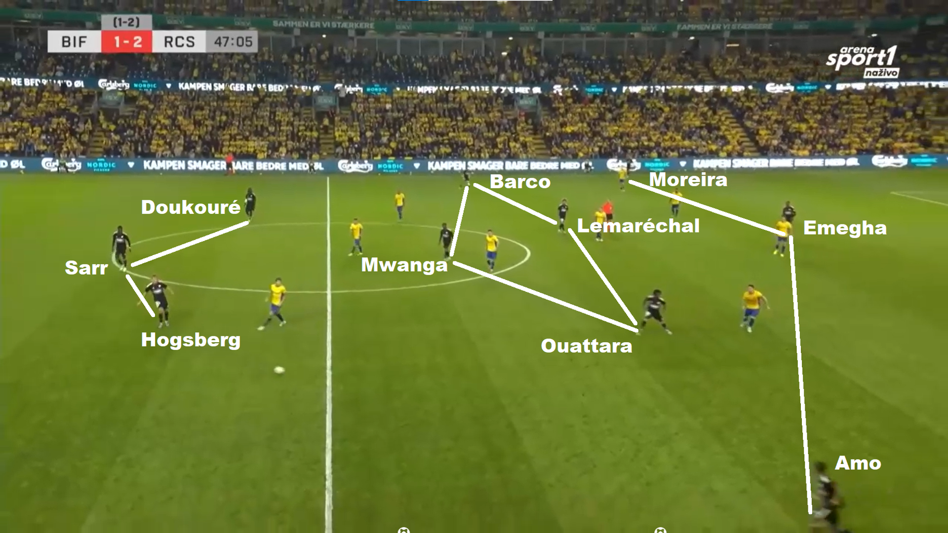 Una volta in possesso, l’obiettivo è quello di risalire il campo più velocemente possibile. Per farlo si può passare dalle fasce, dove Doué a destra e Diego Moreira a sinistra uniscono doti atletiche e tecniche davvero sopra la media - entrambi sono in cima a tutte le statistiche per conduzioni e dribbling nel loro ruolo, rispettivamente tra i terzini e tra i centrocampisti - oppure innescare le combinazioni tra i quattro giocatori al centro, sempre molto fluidi nei loro movimenti per creare triangoli o per inserirsi nei corridoi. Tornate su al primo gol di Panichelli contro il PSG: fate caso alla sovrapposizione interna del numero 19 Enciso, il trequartista di centro destra, fondamentale per portare via Lucas Hernandez e lasciare a Doué abbastanza tempo e spazio per prendere la mira e crossare. Nell’immagine sotto, invece, vediamo i 4 di centrocampo disposti in un rombo in fase di possesso, nella partita contro il Brondby.