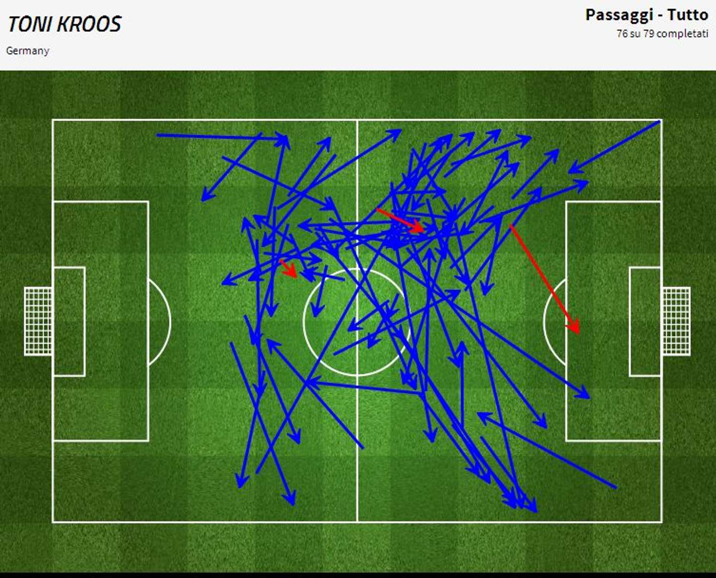 Kroos sbaglia solamente 3 dei 79 passaggi effettuati. Oltretutto, uno dei tre passaggi sbagliati è in realtà il cross che porta al secondo gol di Thomas Müller, praticamente un assist. Fino a quando c’è stata una partita, fino all’espulsione di Pepe, Kroos non sbaglia nemmeno un passaggio.