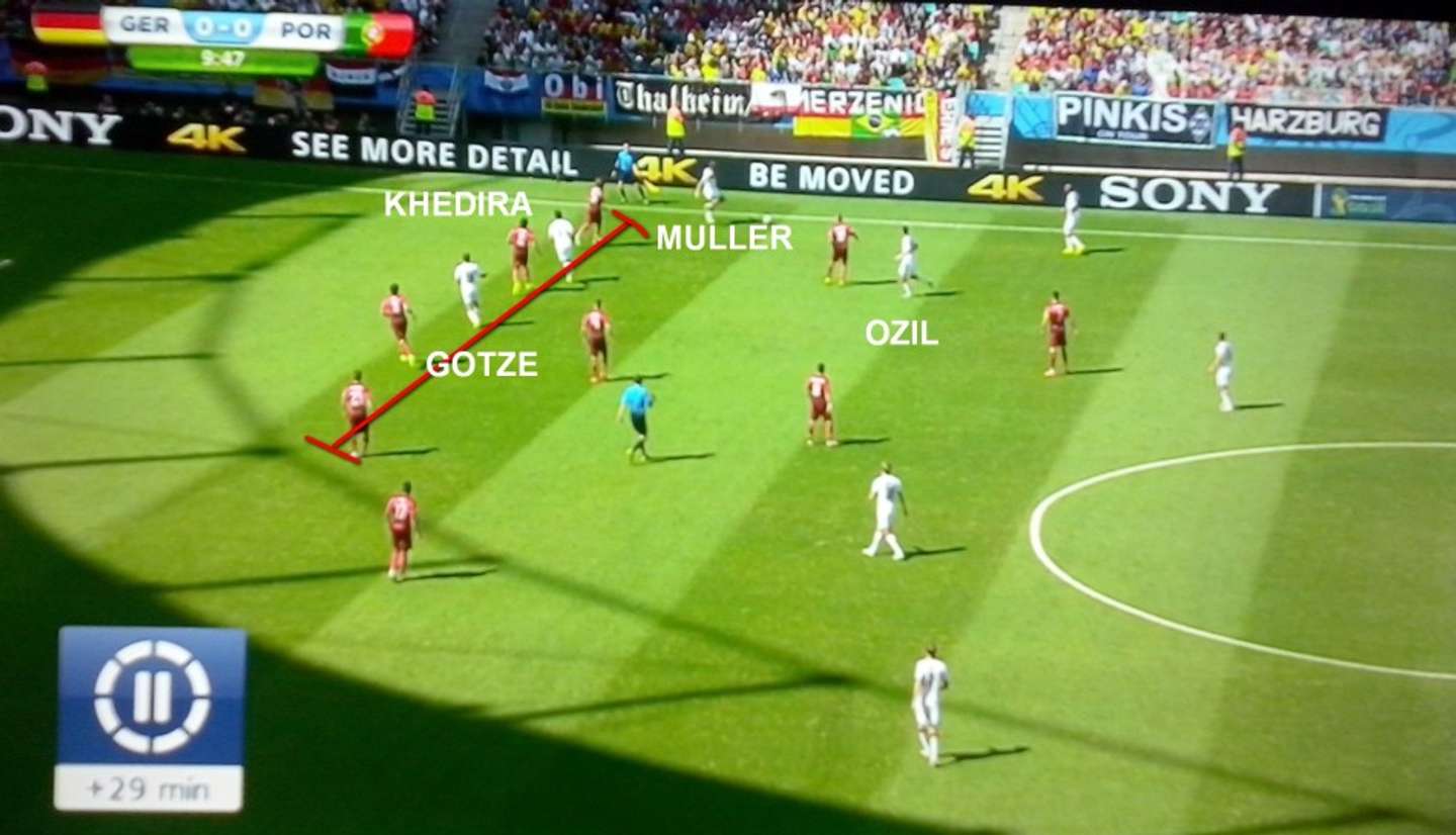 Dopo essere andata in vantaggio la Germania sembra giocare più sciolta: In fase di possesso palla la pressione alta del Portogallo viene gestita dai tedeschi con estrema tranquillità, mentre in fase di non possesso la scelta di Löw è quella di schierare il proprio centrocampo nei pressi della linea mediana e da questa posizione attuare una ricerca attiva del pallone sui portatori di palla avversari. Con il pallone in possesso dei portoghesi non si ripropone, a parti invertite, il duello Lahm-Veloso perché il giocatore del Bayern rimane basso a protezione della difesa e il mediano lusitano viene disturbato nel suo possesso palla dall’infaticabile Thomas Müller che viene da dietro.