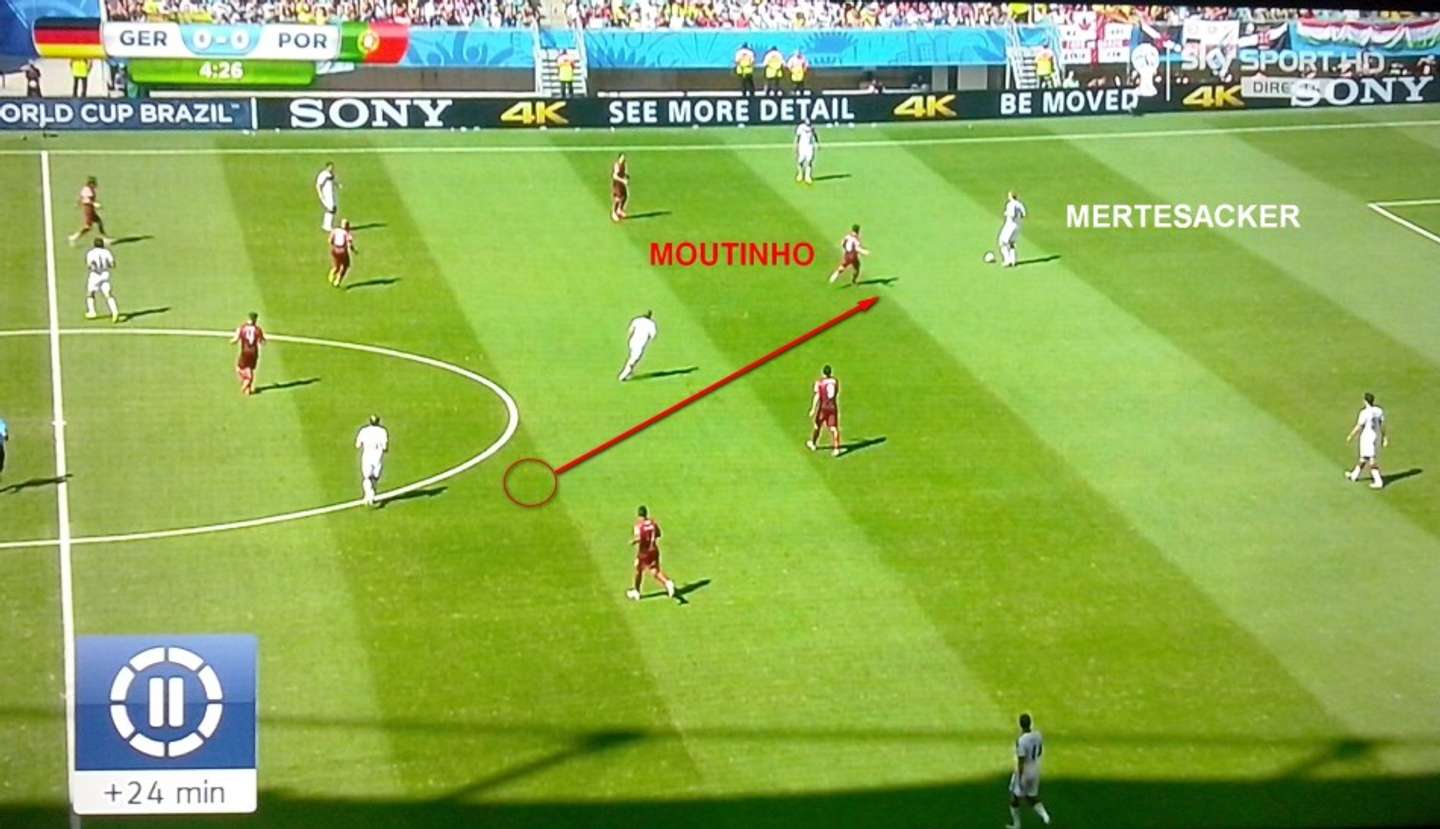 Moutinho molla la sua zona e il controllo di Kroos e va a pressare altissimo Mertesacker, sul centro-destra della difesa della Germania.