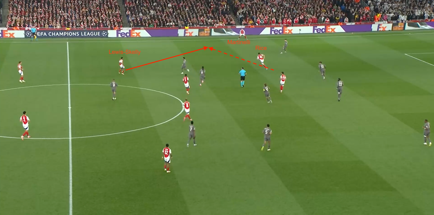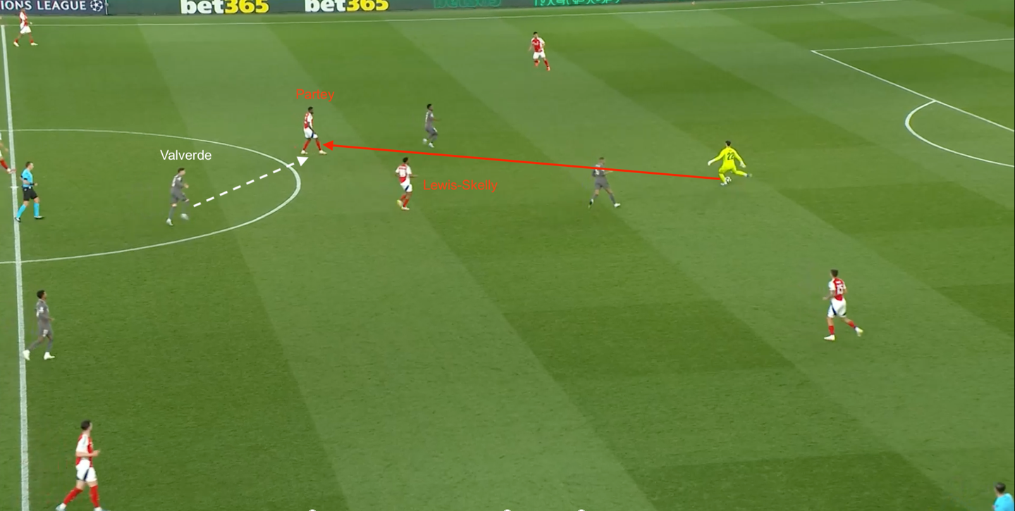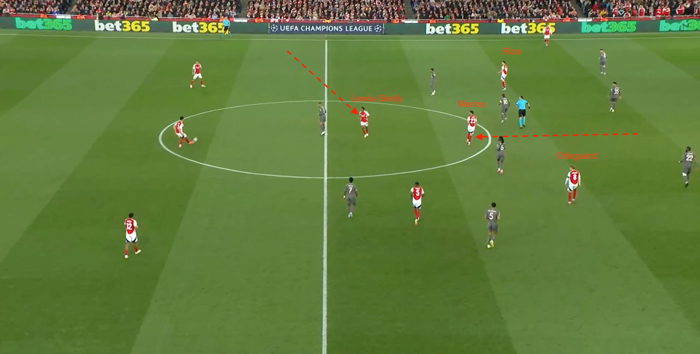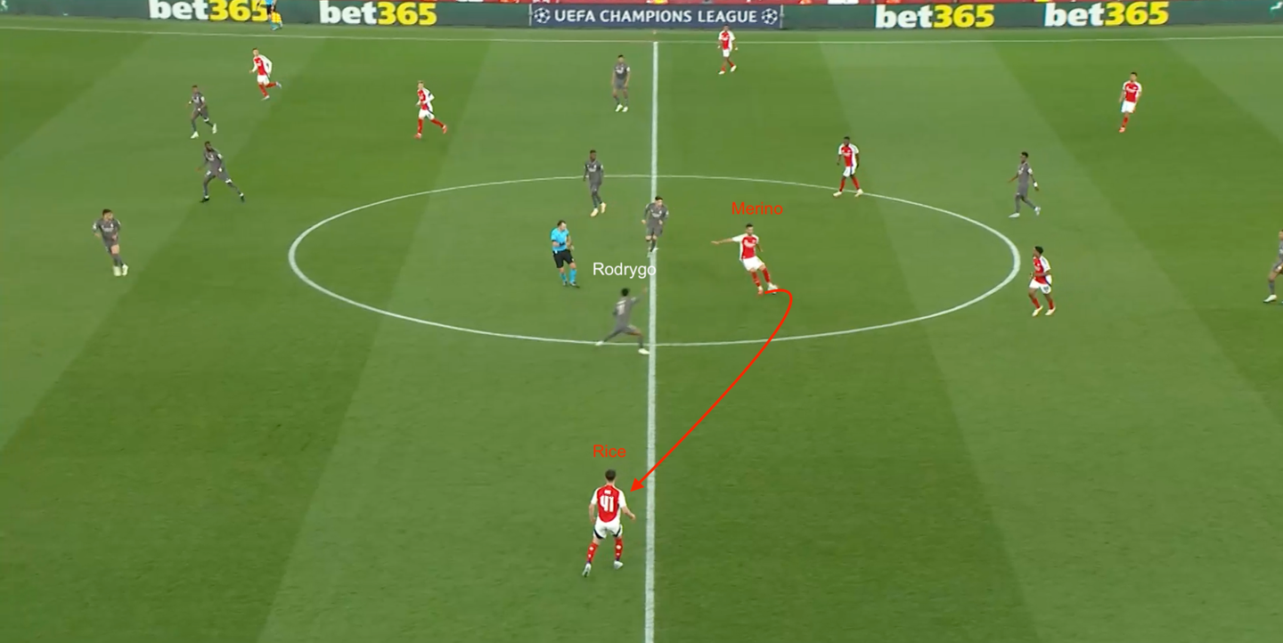 La costruzione del terzo gol dell'Arsenal si poggia sul suo piano gara: Lewis-Skelly da falso terzino (che in questo casa manda fuori strada Valverde); Merino che scende centralmente tra i due mediani avversari per aiutare in costruzione; movimento a uscire di Declan Rice per arrivare sulla trequarti .