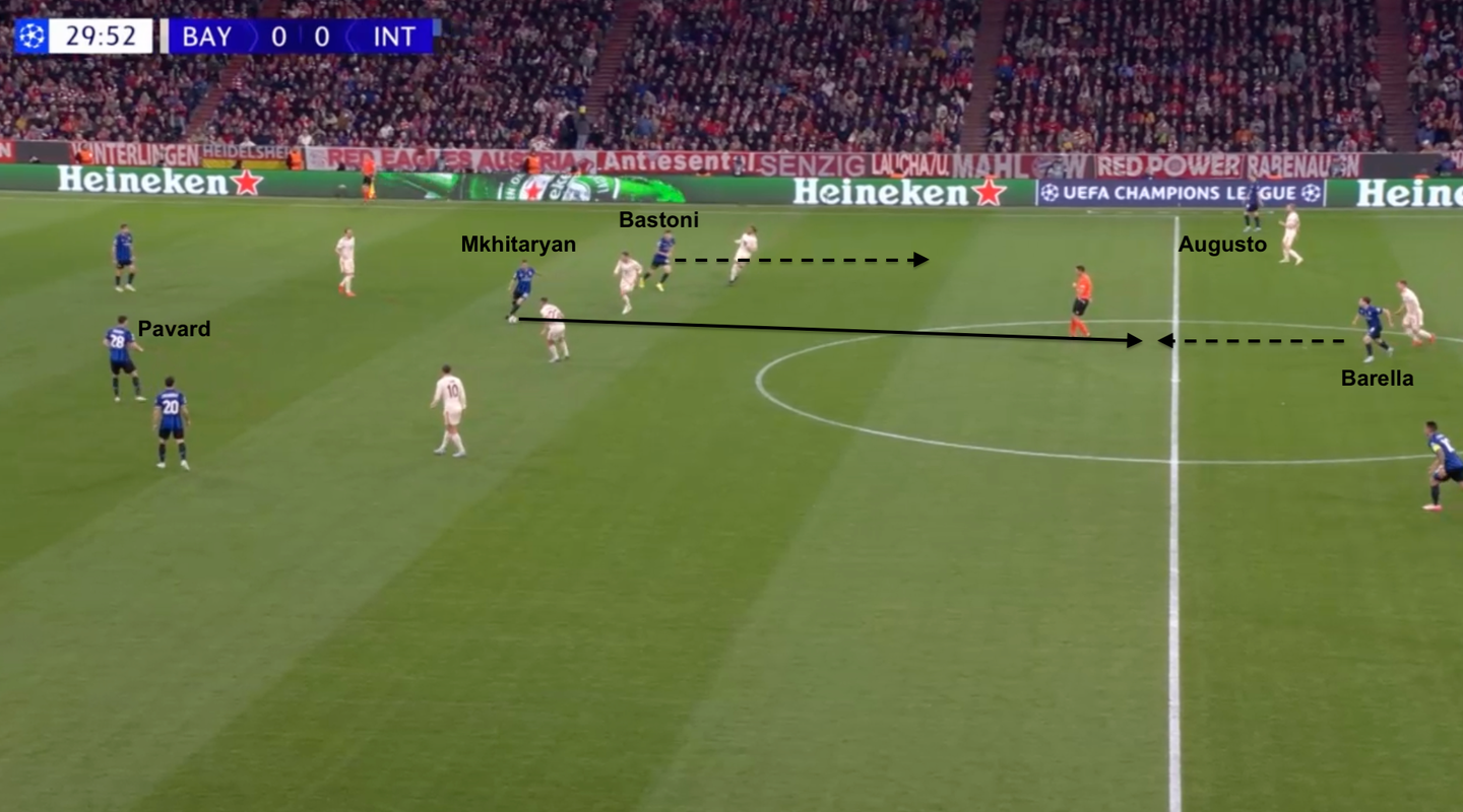 Il perfetto esempio arriva alla mezz'ora. L’Inter palleggia bene e con ritmo, ritorna più volte indietro per assorbire il pressing avversario e poi in avanti per minacciare l’area. Siamo ora nella metà campo dell’Inter con Pavard che passa a Mkhitaryan, seguito alle spalle da Goretzka. L’armeno controlla il pallone e serve davanti a sé il movimento incontro di Barella. Quello, invece di controllare il pallone, di tacco serve ancora in verticale Bastoni.