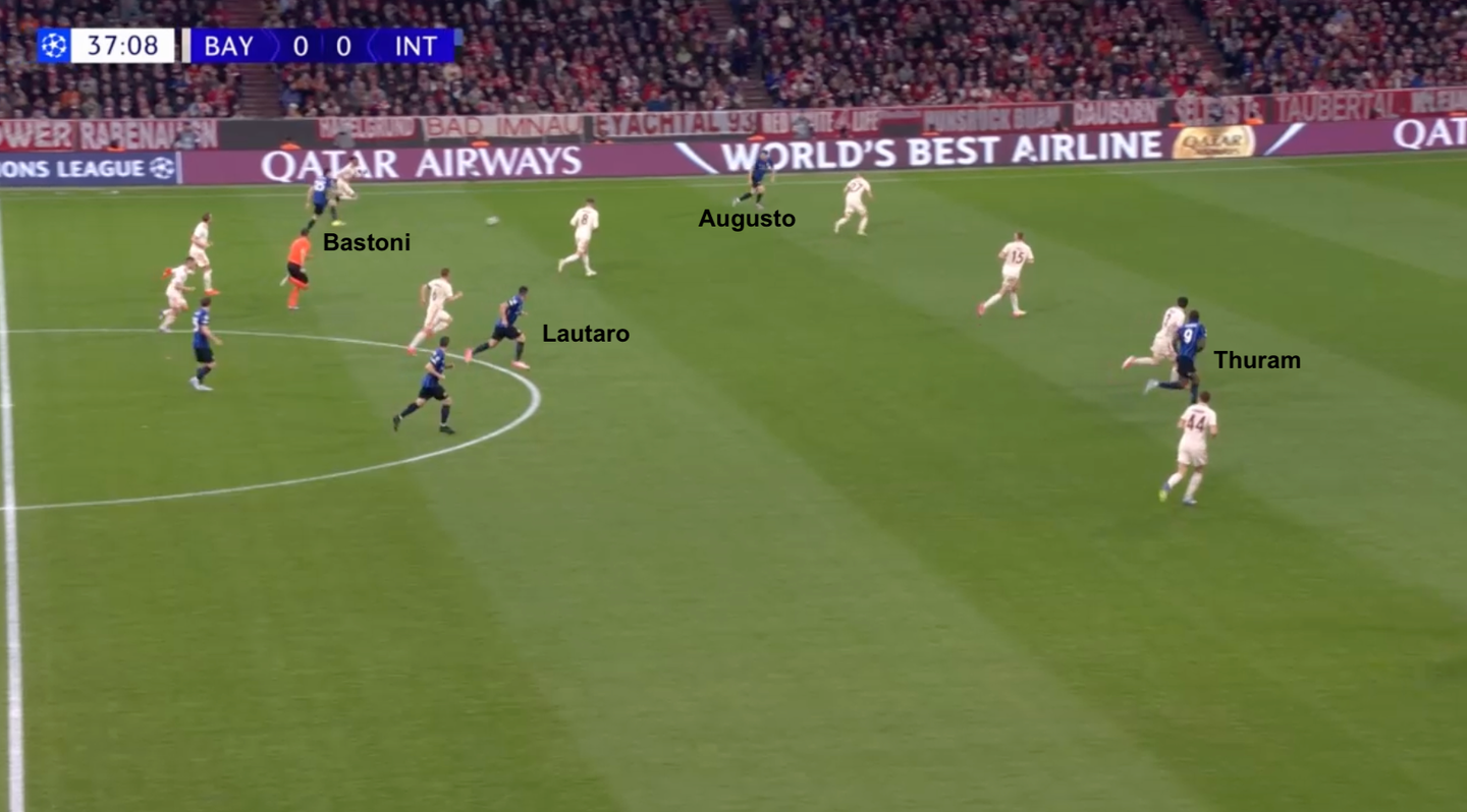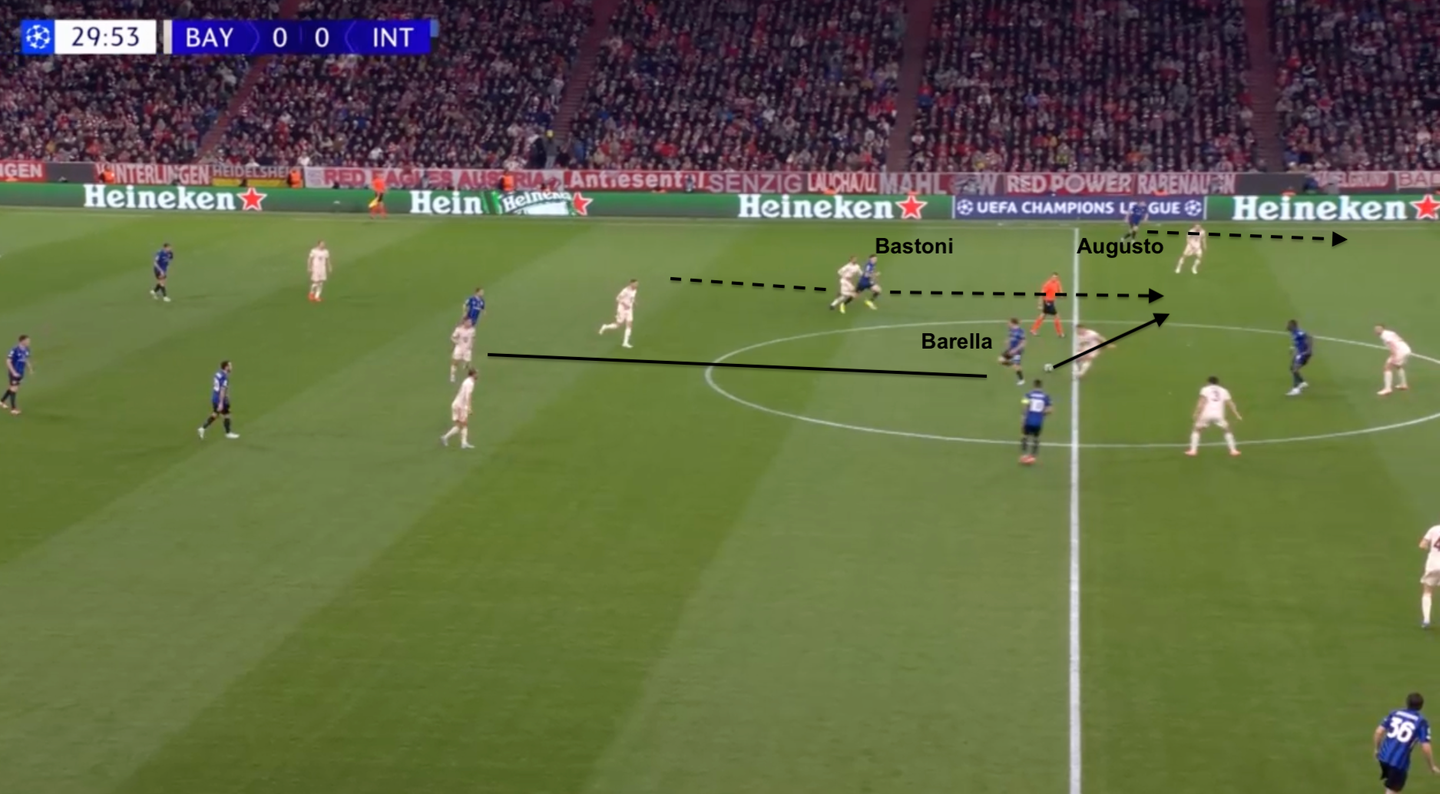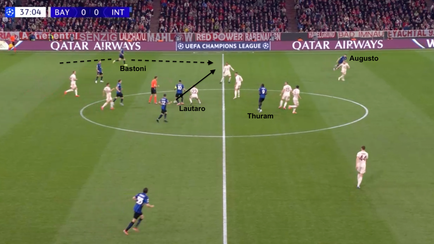 Si parte sempre da Sommer che con un rilancio con le mani per Barella sceso fino alla propria trequarti sorprende il Bayern e fa scattare una transizione difensiva catastrofica dei bavaresi, che si trovano sempre un passo indietro rispetto ai movimenti nerazzurri. Barella con un pregevole esterno di prima in verticale trova Lautaro a centrocampo spalle alla porta e il capitano dopo lo stop si gira e gli restituisce il pallone. Il guizzo tecnico e il dinamismo di Barella sono la chiave di volta dell’azione, ma il gioco spalle alla porta di Lautaro (aspetto in cui è tra i migliori al mondo) è una delle principali sicurezze tecniche su cui si fonda la manovra di Inzaghi.