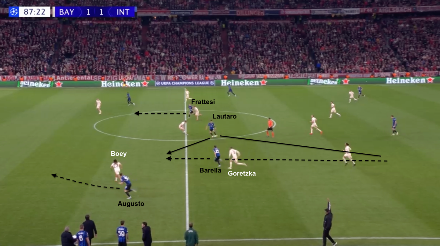Boey lascia Carlos Augusto in fascia per andare a sbarrare la strada a Barella. Lo fa perché non si fida del recupero del compagno Goretzka su di lui. Barella però è in anticipo e serve la corsa in avanti di Carlos Augusto. Una volta in area il terzino ha tutto il tempo e lo spazio per crossare basso in area piccola per l’incursione di Frattesi, che segna al minuto 88 come Goran Pandev nel 2011, togliendosi la maglia come Pandev, mostrando la maglia della salute come Pandev. Una madelaine fortissima di una delle rimonte più epiche della storia interista.