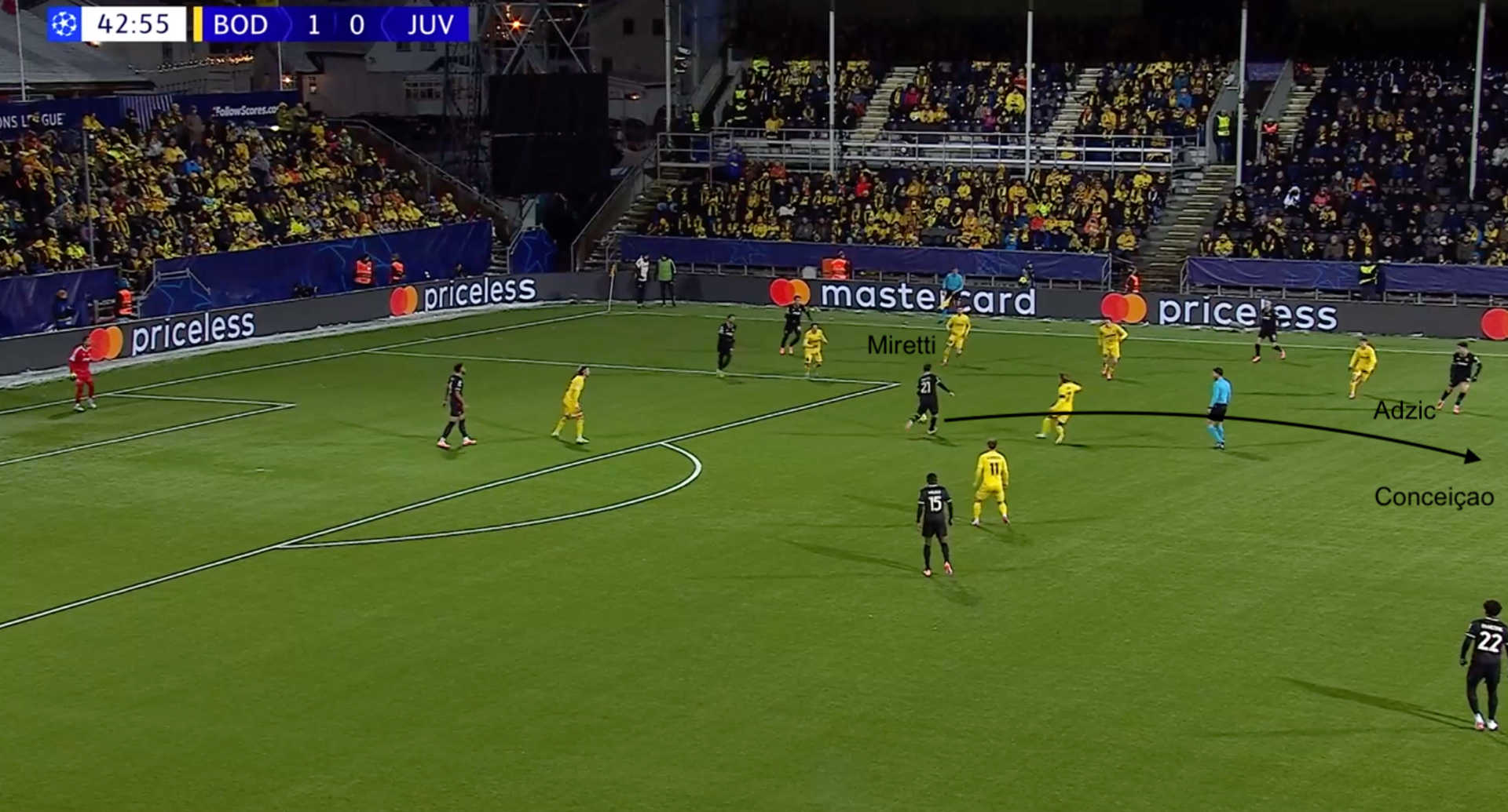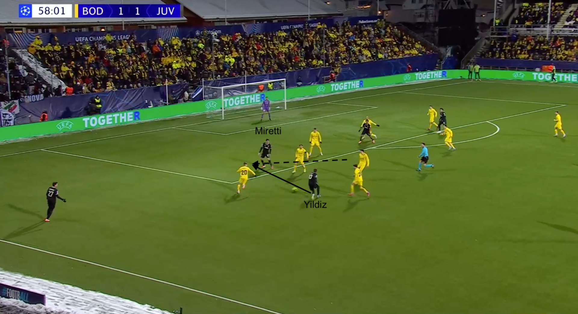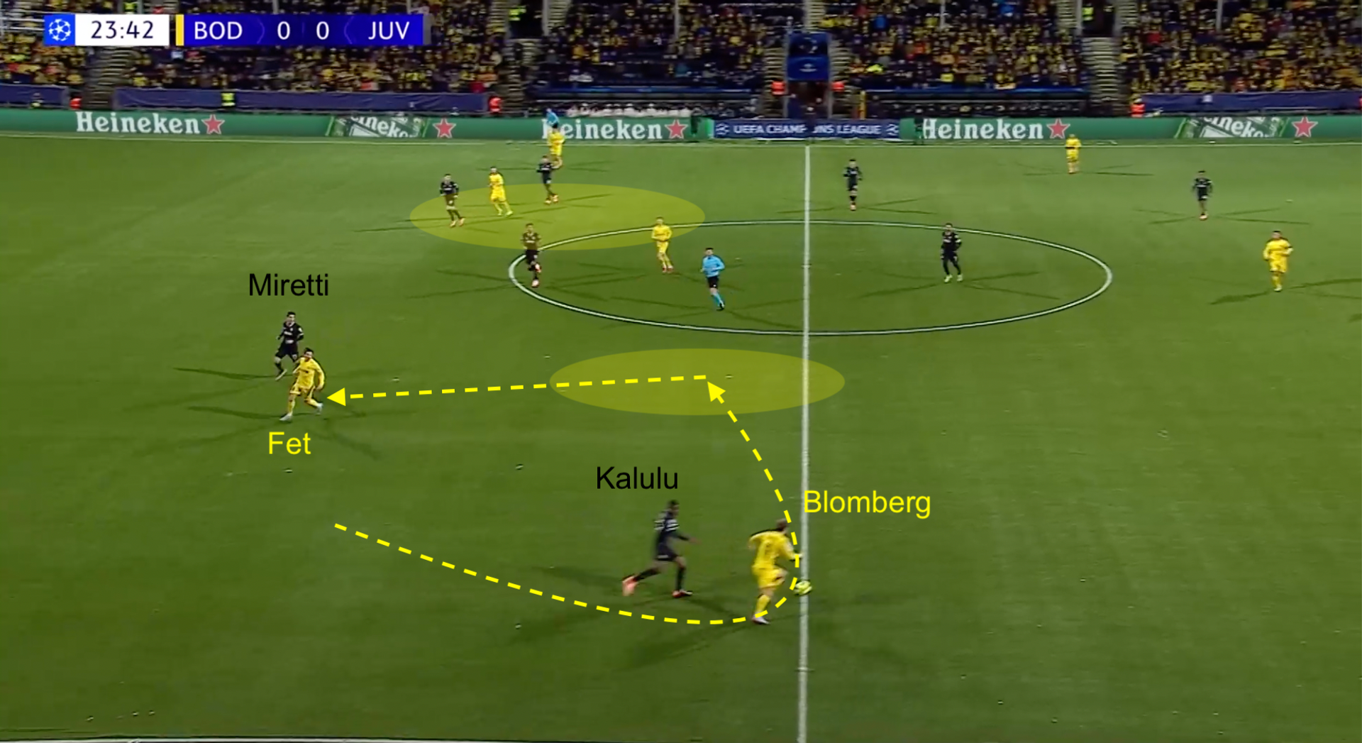 La Juventus nel primo tempo ha sofferto soprattutto la difesa dei mezzi spazi che il Bodo, seguendo alla lettera il manuale del gioco di posizione, occupava con le due mezzali (che ieri erano Evjen e Fet) oppure con l’accentramento delle due ali (Blomberg e Mättää). Il classico triangolo che si veniva a creare con il terzino ha messo in crisi la difesa della Juventus, soprattutto i due "braccetti" (Kalulu e Koopmeiners), che per via di queste rotazioni sembravano sempre un attimo in ritardo a spezzare la linea di difesa per uscire sulle ricezioni tra le linee.