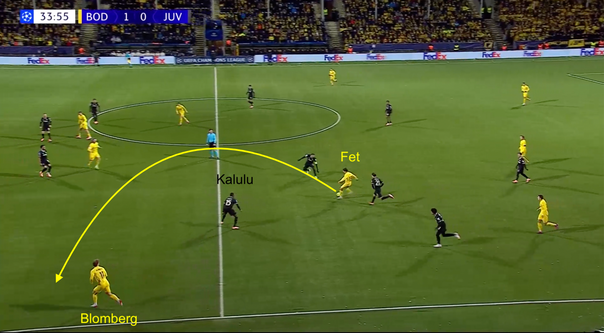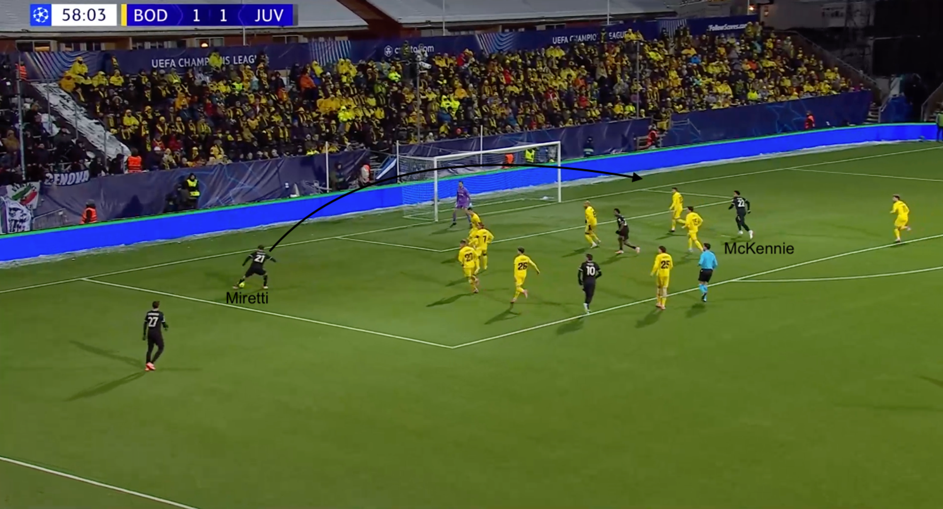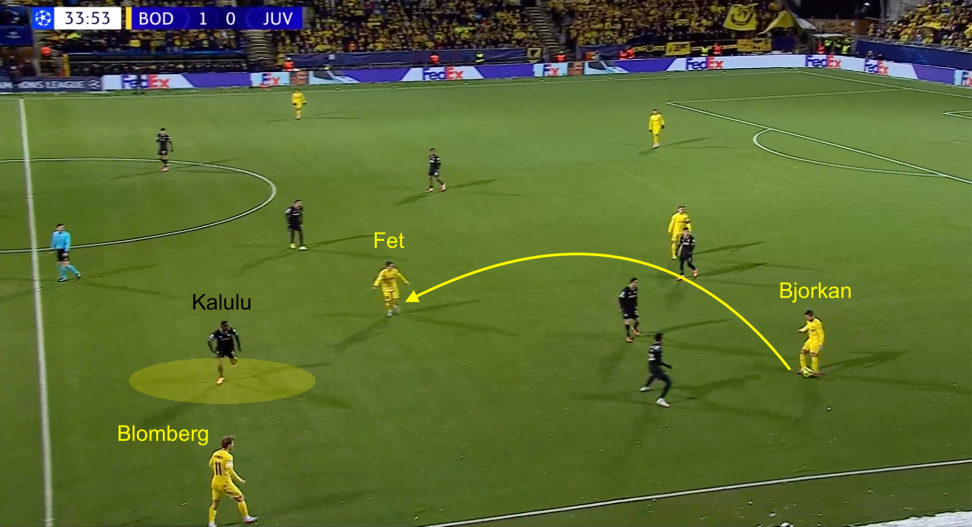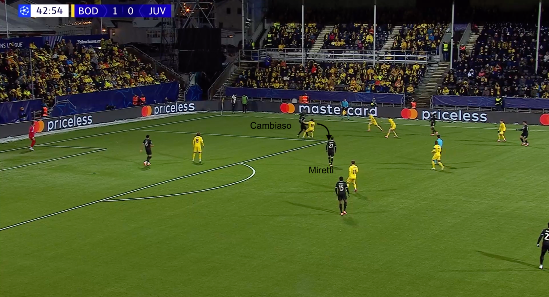 La Juventus nel primo tempo ha sofferto soprattutto la difesa dei mezzi spazi che il Bodo, seguendo alla lettera il manuale del gioco di posizione, occupava con le due mezzali (che ieri erano Evjen e Fet) oppure con l’accentramento delle due ali (Blomberg e Mättää). Il classico triangolo che si veniva a creare con il terzino ha messo in crisi la difesa della Juventus, soprattutto i due "braccetti" (Kalulu e Koopmeiners), che per via di queste rotazioni sembravano sempre un attimo in ritardo a spezzare la linea di difesa per uscire sulle ricezioni tra le linee.