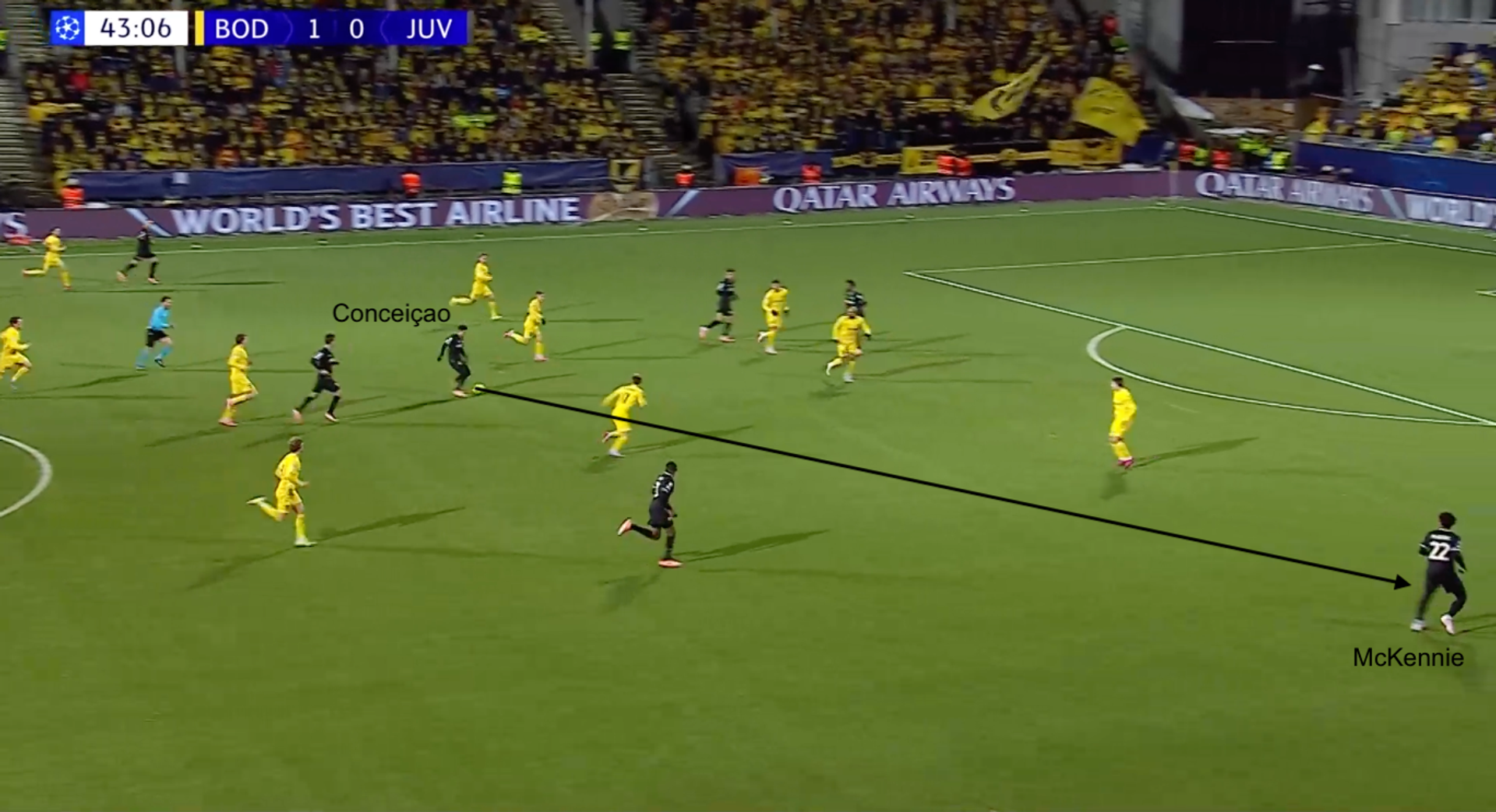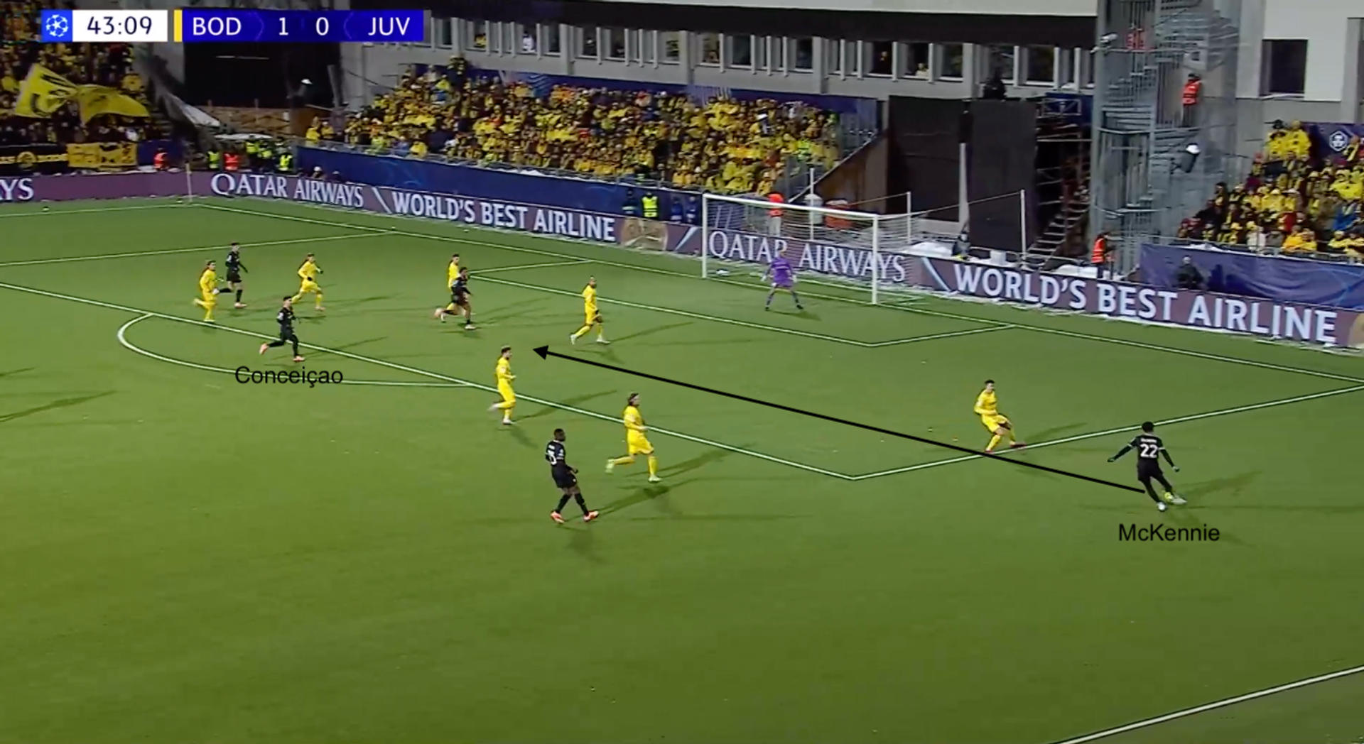 Non a caso, nel corso del secondo tempo, sono diventati sempre più importanti i cambi di gioco, con cui la Juventus trovava sempre Conceiçao in isolamento a destra dopo che il Bodo si era concentrato tutto dall’altra parte per cercare di tamponare Yildiz; e gli inserimenti delle due mezzali nei corridoi intermedi, diventati molto più difficili da difendere per la squadra norvegese una volta che il fronte dell’attacco bianconero si era esteso a tutta l’estensione orizzontale del campo.