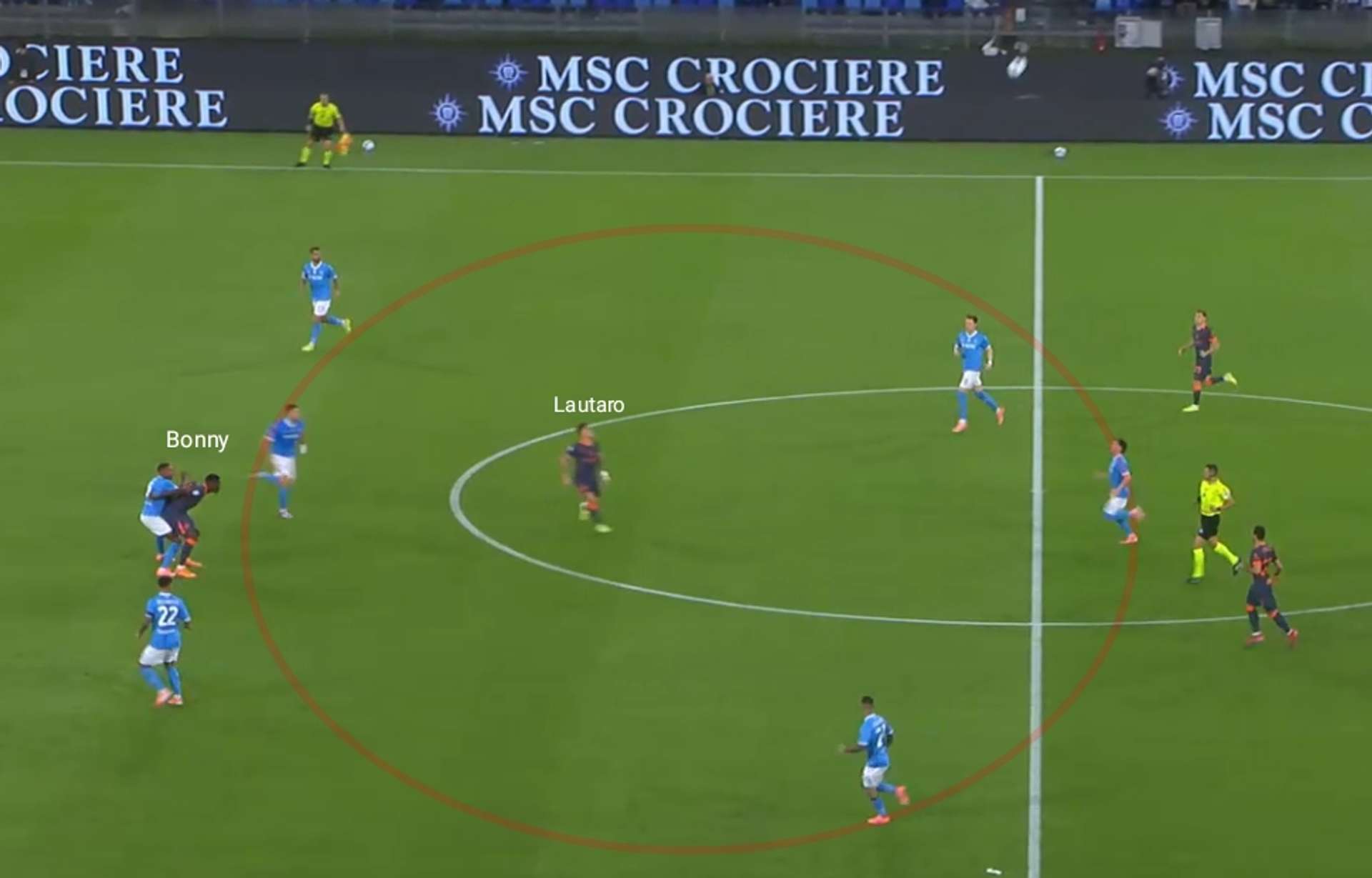Nella stagione corrente, gli abbiamo visto proteggere il pallone in maniera sistematica anche quando ha giocato in coppia con Lautaro Martinez. La prestazione contro il Napoli è la definizione di questo concetto: Buongiorno e Juan Jesus lo limitano, ma Bonny non rinuncia al duello fisico, va a contatto con i difensori con continuità, gioca quasi totalmente spalle alla porta, lasciando piena libertà di movimento a Lautaro.