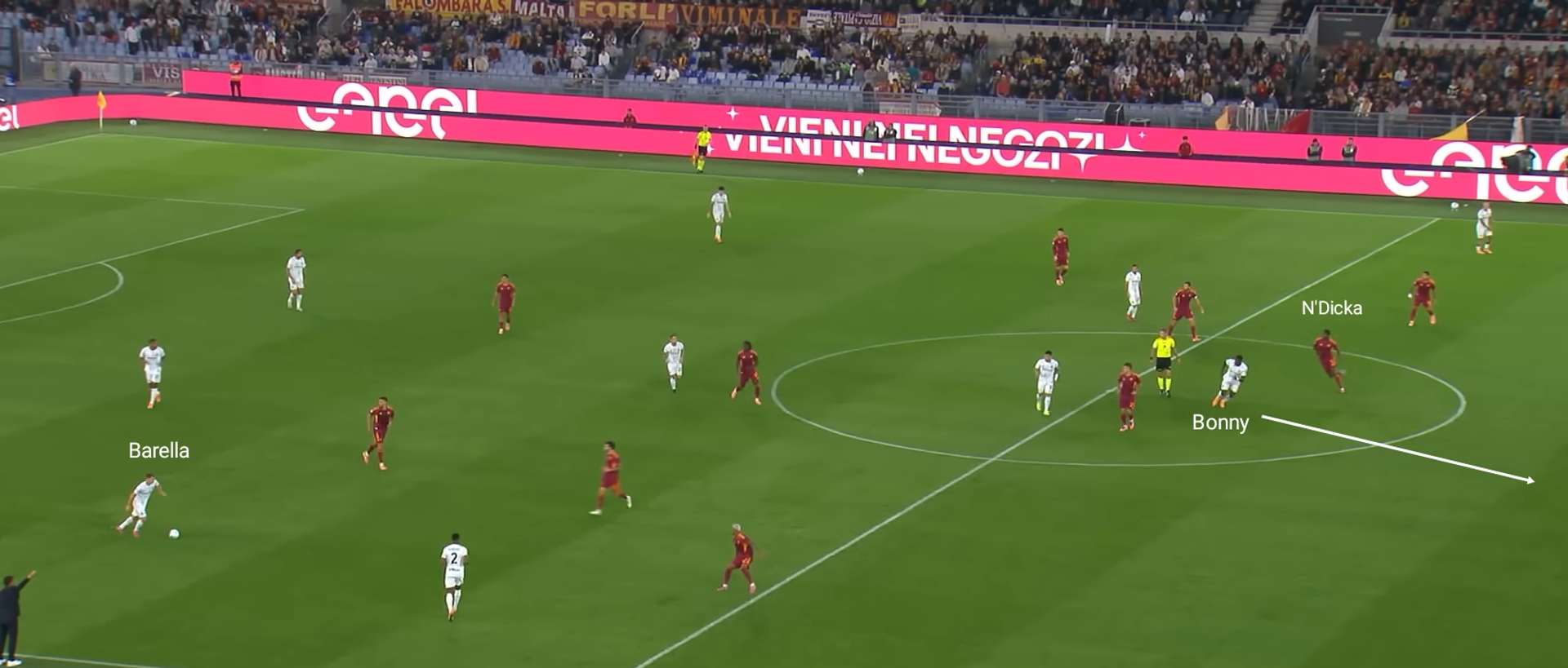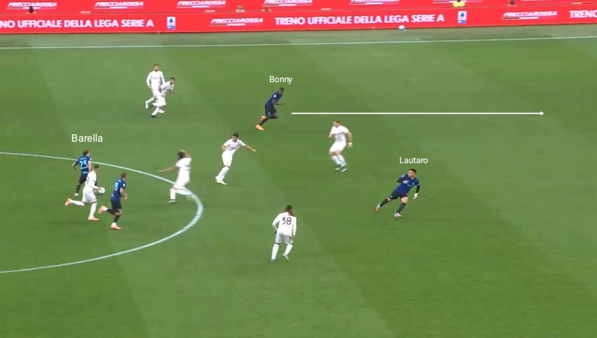 Bonny ha una tecnica impeccabile: pianta gli appoggi, fa perno sul difensore e, alternativamente, subisce fallo o scarica per un compagno. Già nella passata stagione, la stessa Inter ne aveva subito le conseguenze nel famigerato 2-2 a Parma, in cui i nerazzurri si sono giocati una porzione consistente di Scudetto. In quel caso Bonny aveva utilizzato il fisico su Carlos Augusto per poi armare il mancino di Bernabé.