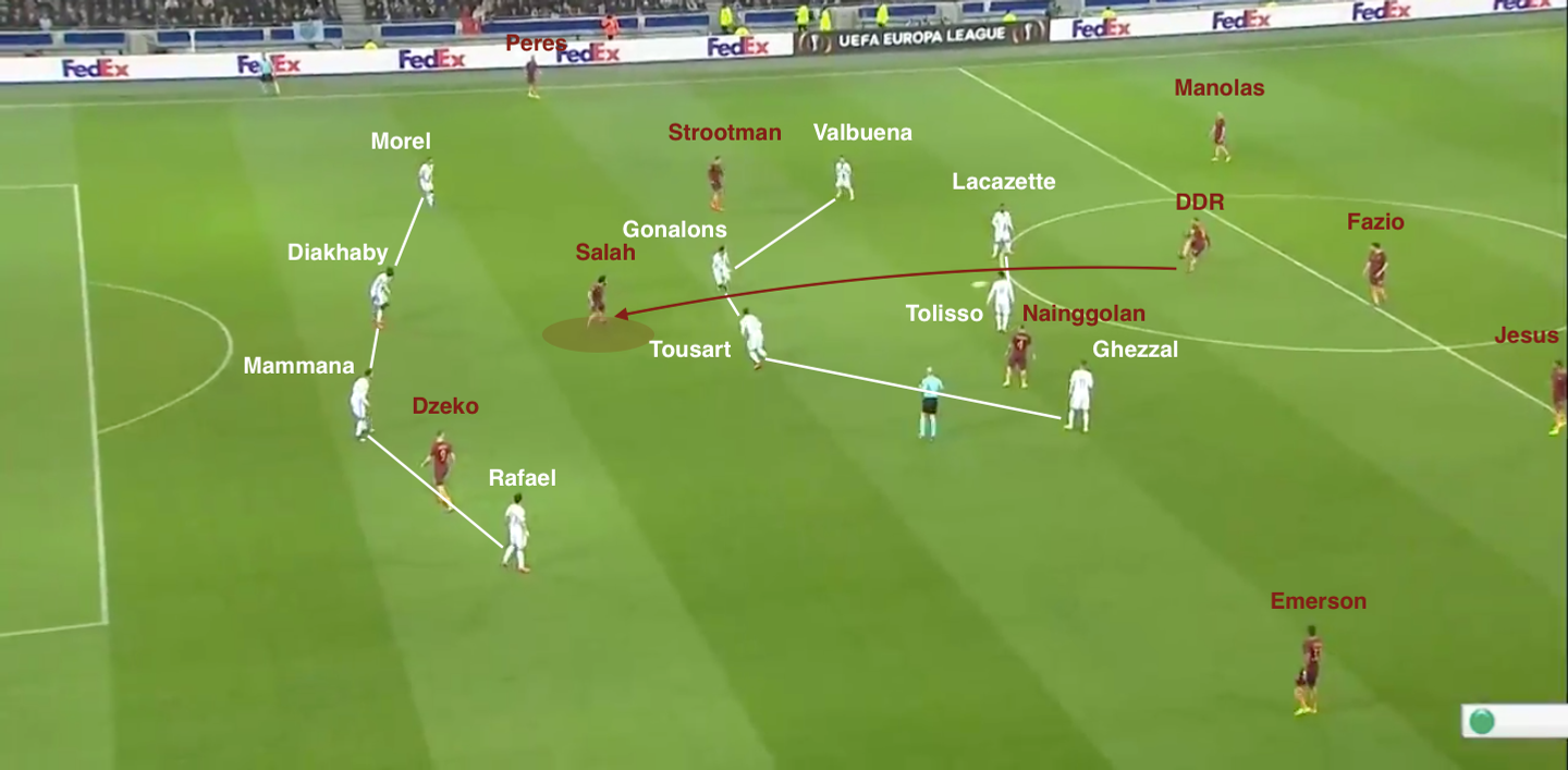 La Roma aveva tutte le carte in regola per dominare tatticamente l’avversario. Il rombo di prima costruzione era sempre in superiorità numerica rispetto ai due giocatori offensivi del Lione, permettendole di fare uscire quasi sempre il pallone pulito dalla difesa. Tousart e Gonalons erano indecisi se schermare Nainggolan e Strootman, che potevano ricevere ai loro fianchi, o stringere a coprire lo spazio, per impedire la ricezione a Salah, che veniva centralmente tra le linee a prendere il pallone, grazie anche alla passività della difesa avversaria. Emerson e soprattutto Peres, infine, erano liberi di dare ampiezza, con Ghezzal e Valbuena che li seguivano di rado e molto affannosamente.