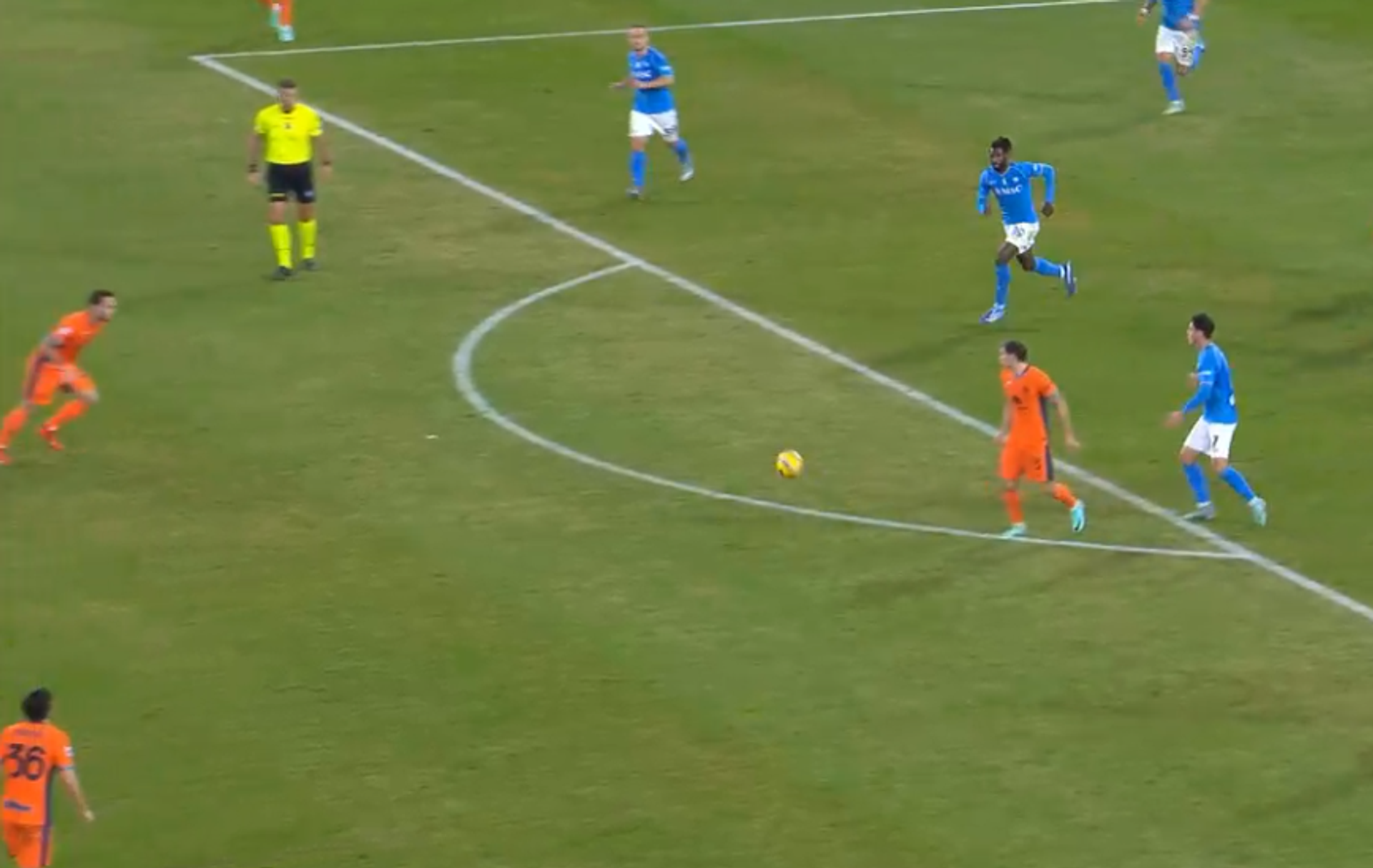 Inter-Fiorentina, sessantaseiesimo. I nerazzurri attaccano con sei giocatori, la Viola è schiacciata a protezione dell'area di rigore. Sta giocando questa partita di difesa oltranzista dall’inizio, e l’Inter sembra sempre meno paziente nella ricerca del gol. Sono ben nove i giocatori dietro la linea della palla quando Barella scarica per Çalhanoğlu. Il turco ha spazio, supera il tentativo di chiusura da parte di Fazzini spostandosi la palla sul destro all’altezza dei venti metri.