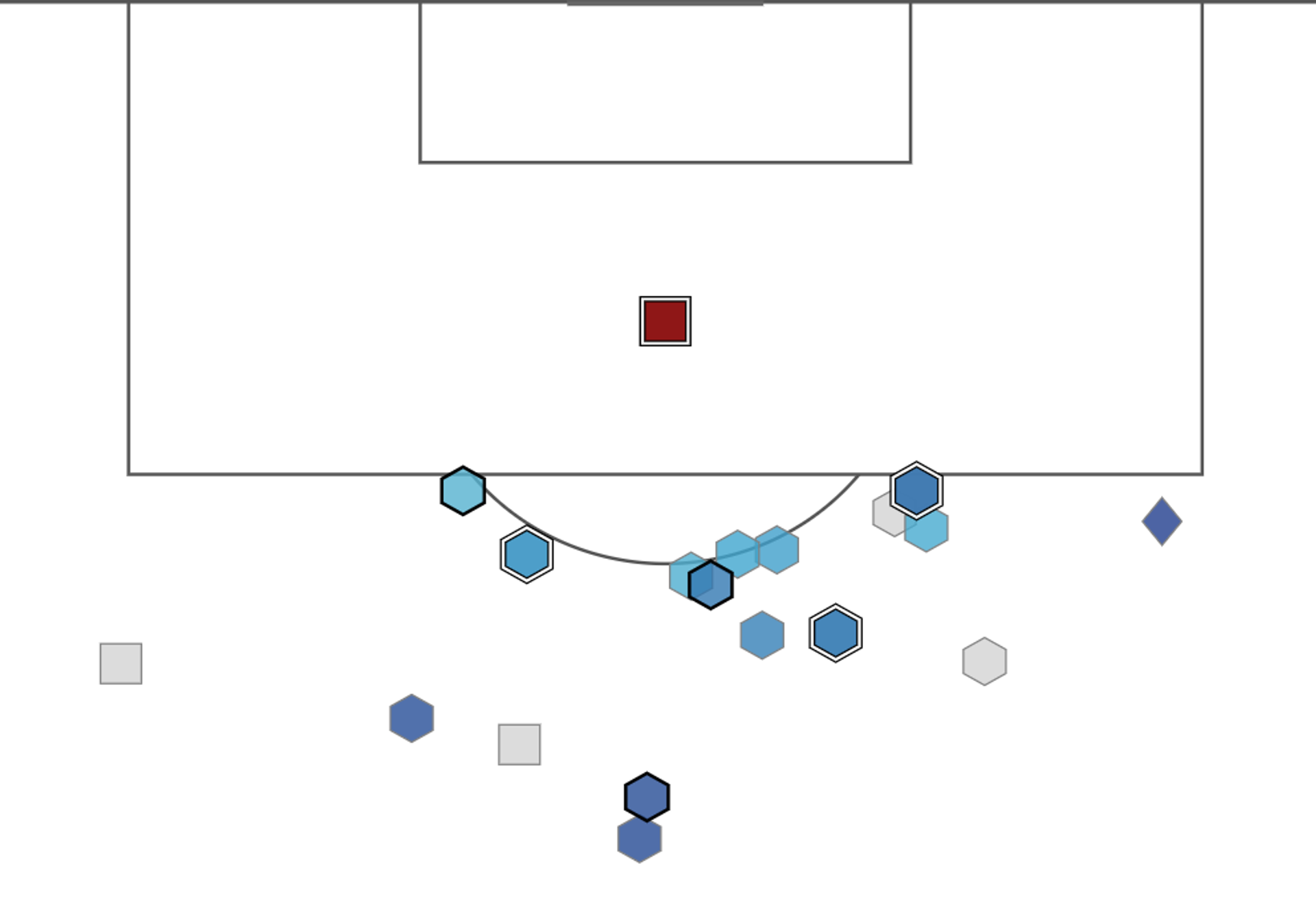 L’immagine qui sopra è la mappa delle conclusioni tentate da Çalhanoğlu in questo inizio di campionato. Il campione statistico è limitato, ma ci aiuta a visualizzare quali zolle di campo tende a occupare per colpire.