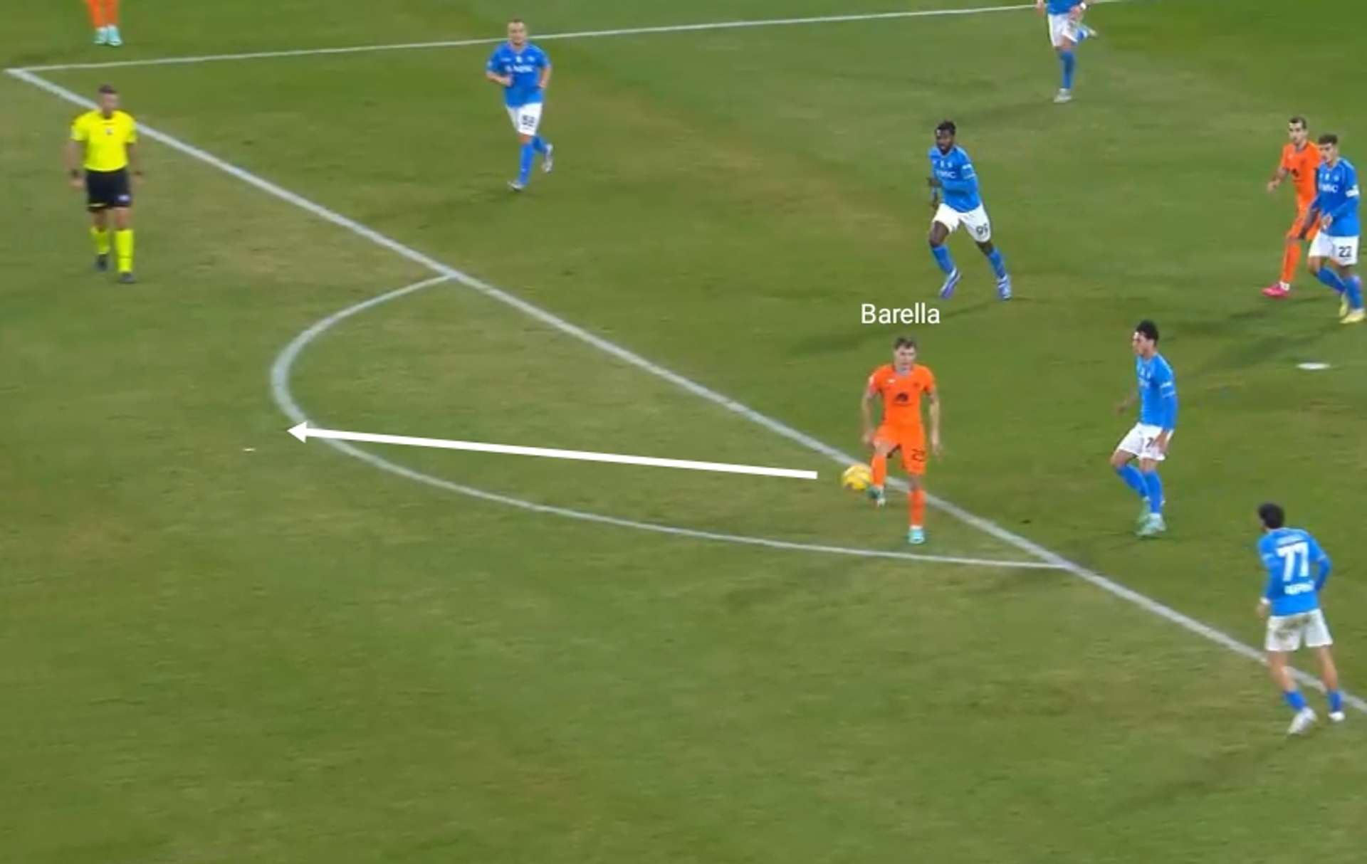 Nelle immagini qui sotto - relative a un gol contro il Napoli a dicembre 2023 - la giocata geniale è di Barella che trova Çalhanoğlu con una deliziosa sponda d’esterno. Il turco nella prima istantanea è fuori dall'inquadratura; Barella non deve nemmeno guardarlo per sapere che sarà lì a raccogliere l’appoggio per andare al tiro di prima.