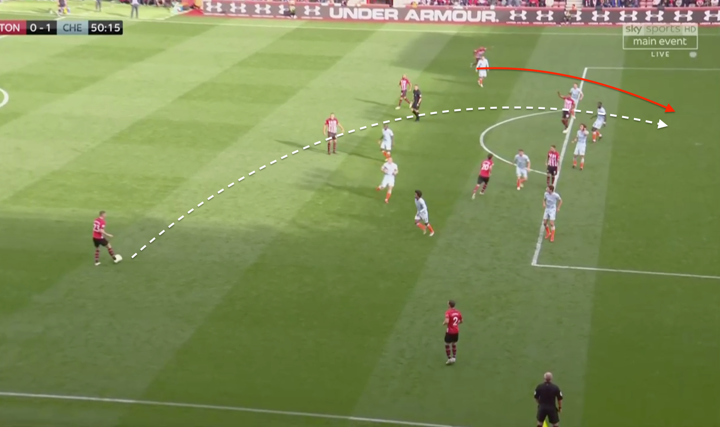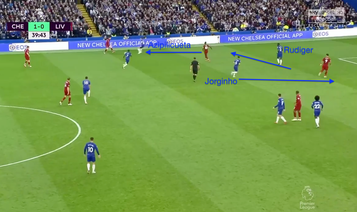 Allora, contro il Liverpool, il Chelsea ha adottato una strategia differente, con il terzino in uscita che veniva coperto dalla scalata di un centrale difensivo. Il buco aperto dal centrale era coperto da Jorginho, che si muoveva così su un percorso molto più corto.
