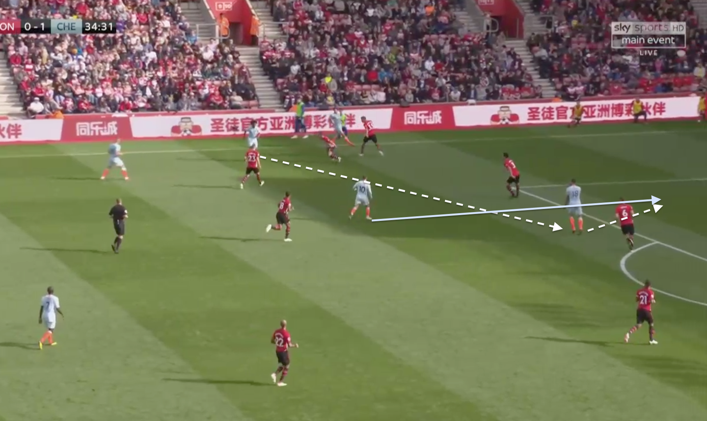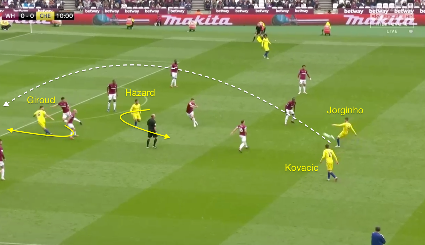 Se dalla tua hai un giocatore come Jorginho, che gioca sempre con la testa alta a scandagliare soluzioni di passaggio in avanti, e uno come Hazard, che ha forza e velocità per fingere il movimento incontro, sterzare e attaccare la profondità, allora in un contesto del genere la connessione tra i due diventa una risorsa.
