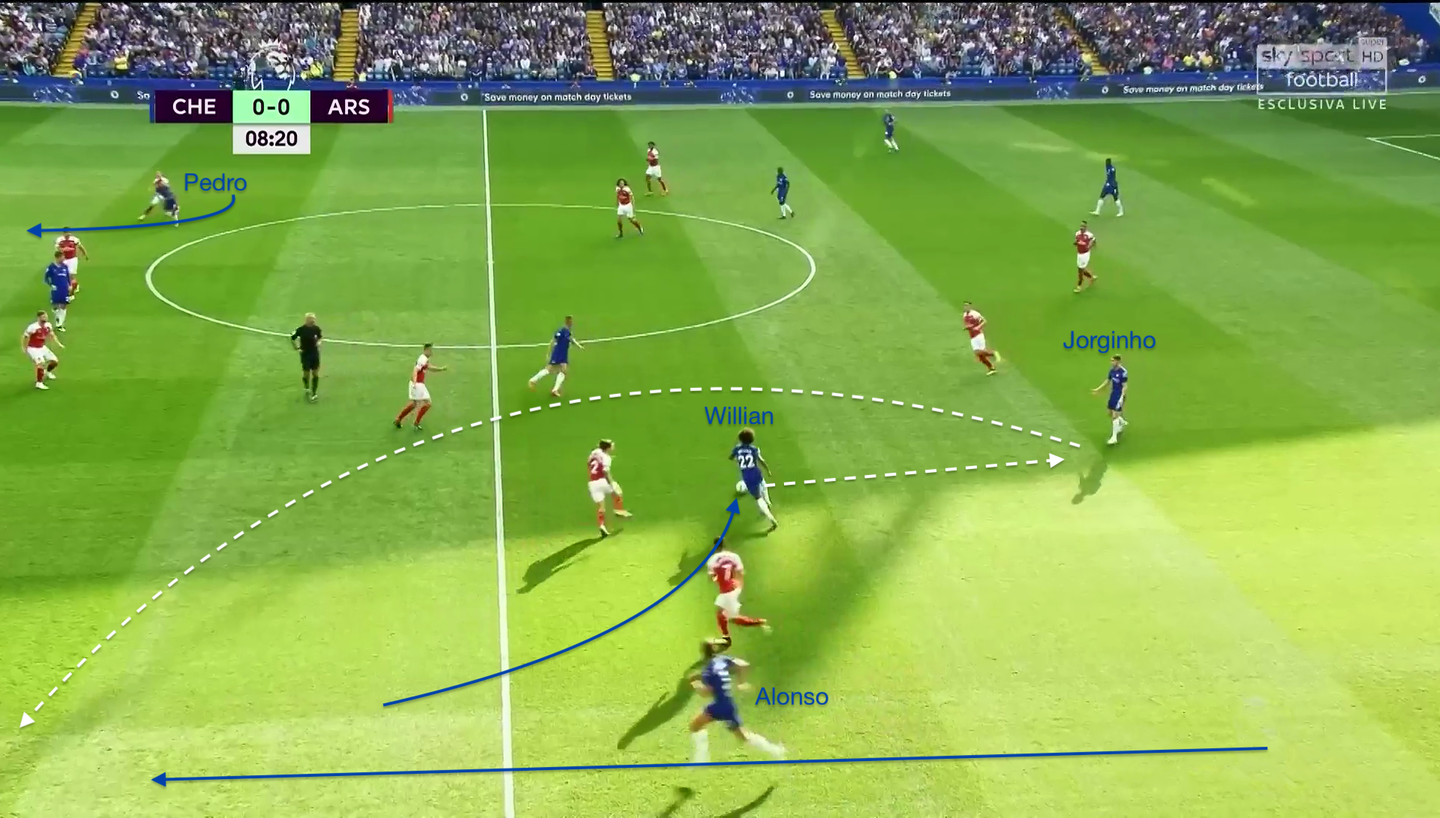 Willian riceve e entra nel campo, portando con sé Bellerin. Alonso si lancia nello spazio liberato sulla fascia, mentre Pedro si porta in una posizione d’anticipo rispetto al suo marcatore. Jorginho, senza pressione, a braccia larghe reclama il pallone per sé, pregustando il lancio di prima in profondità. Segnerà Pedro, liberato davanti alla porta da Alonso.