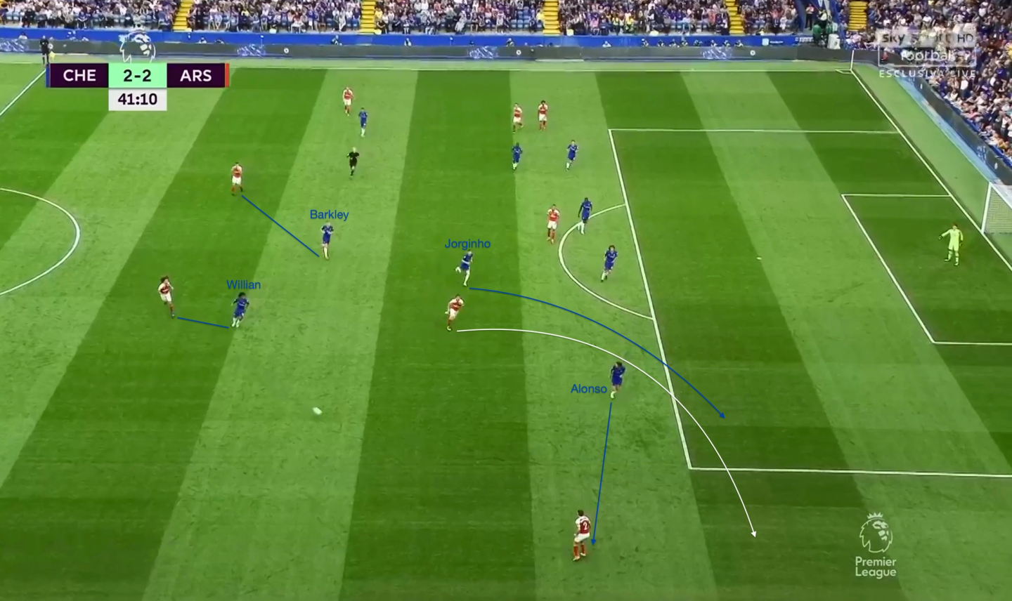 Nell’esempio qui sopra sia Willian che Barkley sono stati attirati fuori dalla linea per coprire la palla sulla circolazione dei centrocampisti dell’Arsenal, mentre Jorginho è stato costretto ad una diagonale lunga sull’uomo che cercava di avvantaggiarsi dello spazio alle spalle di Alonso, spesso troppo alto o troppo largo a causa del mancato rientro del suo esterno d’attacco. Il movimento dell’italo-brasiliano scopriva la zona centrale; o comunque, quando non era in grado di andare a prendere l’uomo in zone profonde, costringeva Alonso ad affrontare un due contro uno.