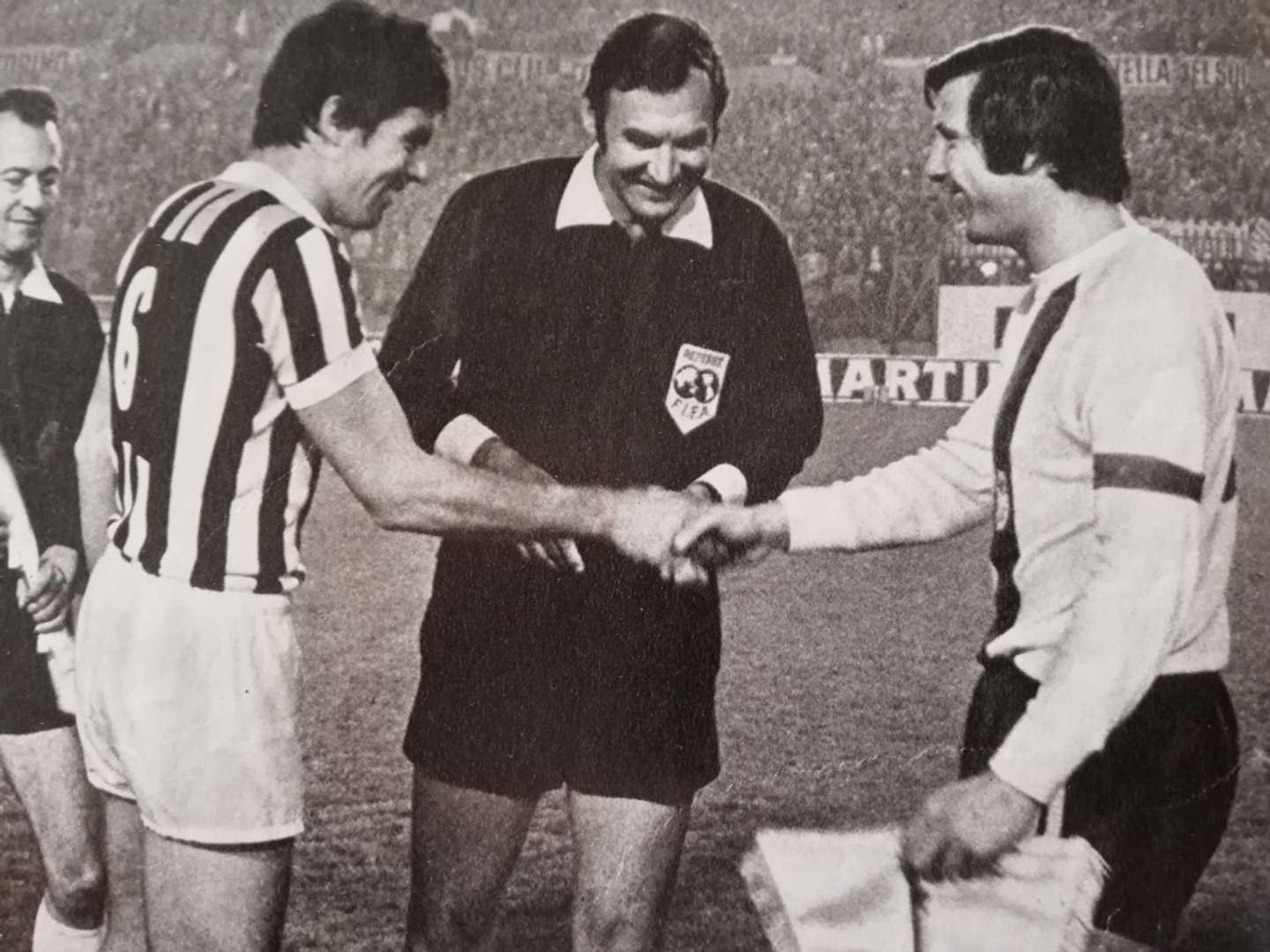 Il prepartita a Torino di Juventus-Magdeburgo con i capitani Sandro Salvadore e Manfred Zapf.