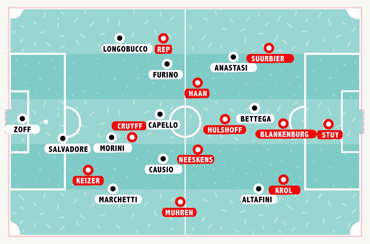 Morini viene costantemente allontanato dal cuore della difesa e dell'area di rigore da Cruijff, mentre Marchetti, il teorico terzino destro, viene risucchiato in mezzo dalla marcatura di Keizer aprendo una voragine nella zona di sinistra dell'attacco olandese, che proprio da quel lato sviluppa preferenzialmente la sua manovra. A sinistra opera infatti Ruud Krol, che da difensore esterno si spinge costantemente in attacco a supportare la manovra offensiva con le sue qualità tecniche. Con Altafini sempre alto, anche in fase di possesso palla avversario, Causio viene costantemente preso in mezzo dal triangolo formato da Krol, Muhren e uno degli interni ajacidi, che utilizza la superiorità numerica e posizionale sulla fascia sinistra per avanzare lungo il campo e dominare il possesso.