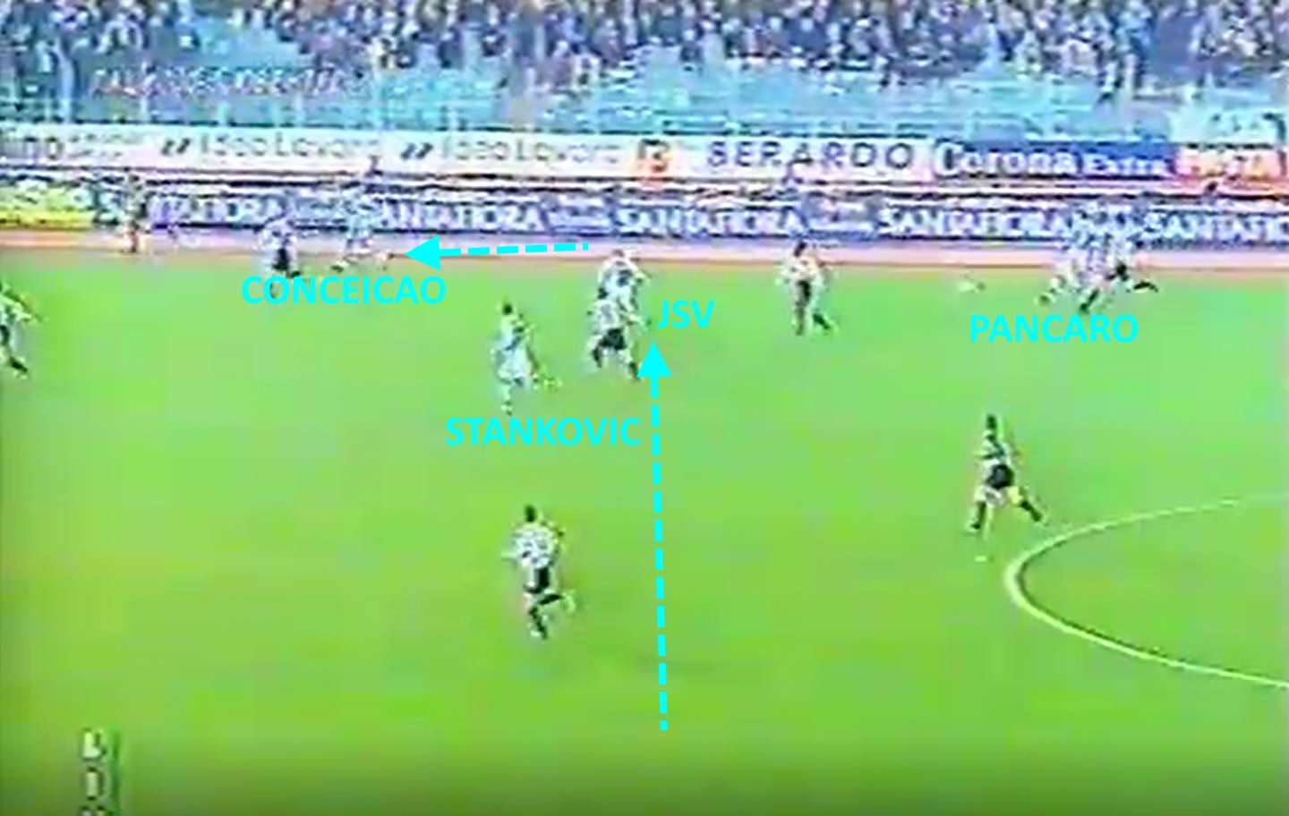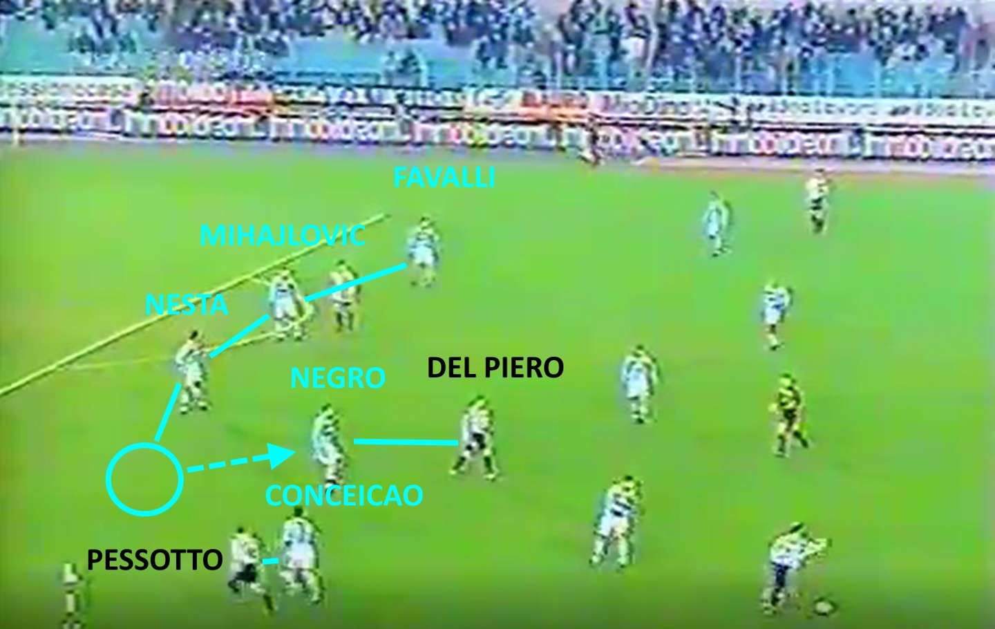 In più i biancocelesti dimostrano di essere una formazione moderna nell’occupazione dei corridoi verticali: se a destra la fascia è presidiata stabilmente da Conceição, con Negro che si sovrappone solo quando il portoghese ha bisogno di un compagno per uscire da un 1 vs 2, sul centro-sinistra si innescano dei giochi più fluidi tra terzino, ala/seconda punta e interno. Il trigger in questi casi è Nedved: i suoi strappi, con o senza palla, determinano la struttura posizionale sul suo lato. Se il ceco converge verso il centro all’altezza della mediana, la mezzapunta compie un movimento compensativo, andando a occupare l’ampiezza o il mezzo spazio alle spalle del centrocampo (con il difensore che sale a possesso consolidato), mentre se si allarga, l’attaccante esterno va a riempire l’area. Le sue accelerazioni permettono alla Lazio di risalire il campo centralmente e attirare gli avversari fuori posizione, aprono spazi e linee di passaggio, in particolare in funzione dell’inserimento di una mezzala. Nedved diventa un fattore nel momento in cui riesce ad accoppiarsi a Boksic o ancora meglio a Pancaro, il giocatore che più mi ha impressionato rivedendolo a posteriori per ambidestria, corsa e agonismo. Un terzino non solo di quantità, ma anche di qualità nella gestione palla e nella rifinitura.