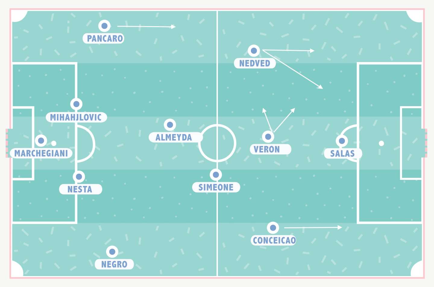 Nedved invece oscilla tra il centro-sinistra e una posizione più esterna, a seconda della presenza di un secondo attaccante o di Verón: con l’ex Parma in campo va a occupare la fascia sinistra in fase difensiva, con Mancini o Boksic, invece, a palla persa si stringe al fianco del mediano. Anche se di fatto il suo gioco in fase offensiva non cambia molto, visto che svaria su tutto il fronte, alternando tracce interne a tagli interno-esterno. Stesso discorso per Verón, formalmente esterno sinistro, o mezzala/trequartista centrale quando c’è Nedved a coprire l’ampiezza, il cui scopo rimane quello di accentrare il gioco e creare superiorità numerica in zona palla.