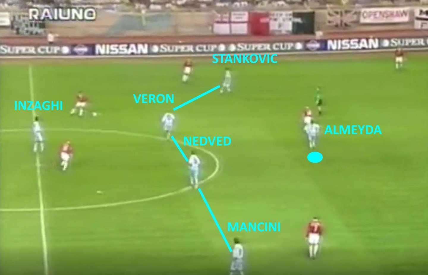 Una delle versioni più offensive della Lazio, qui nella Supercoppa europea contro lo United: due attaccanti, Mancini e Salas, e tre centrocampisti offensivi, Stankovic, Nedved e Verón, con gli ultimi due che si alzano dietro alla seconda linea inglese, coperti da Almeyda.