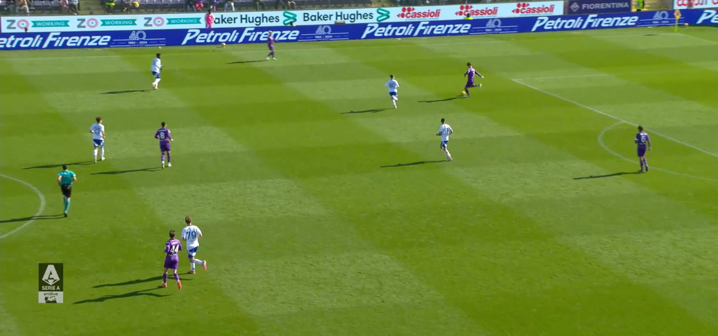 Il pressing alto del Como che ha portato allo 0-2 di Nico Paz, con i riferimenti sull'uomo.