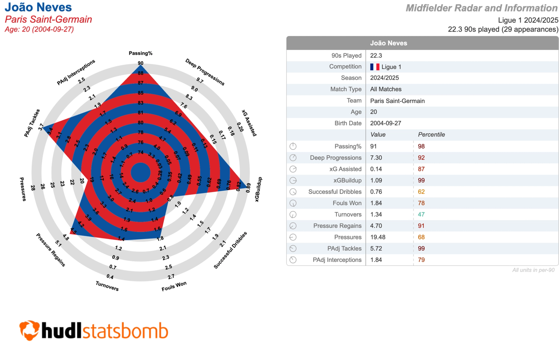 Quando c’è da rubare palla in avanti, recuperare all’indietro, andare in tackle, Joao Neves è un mediano difensivo d’élite.