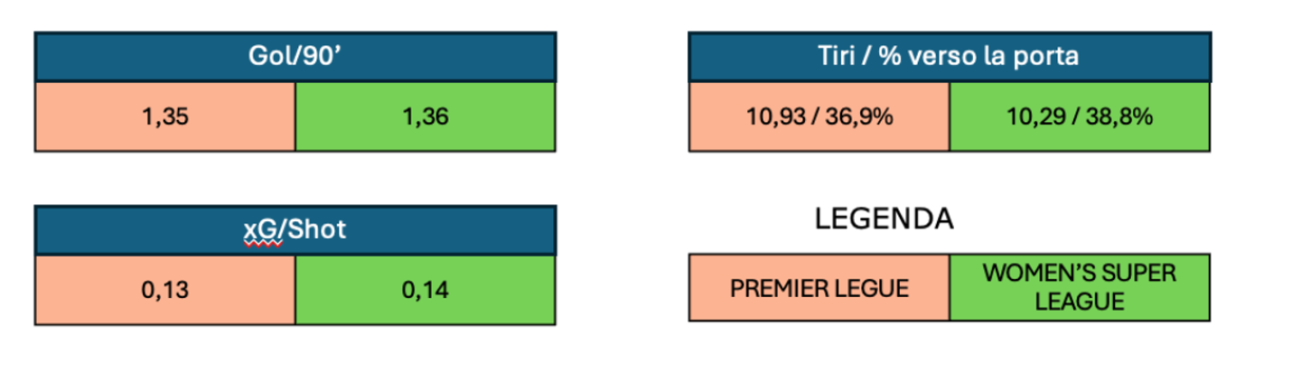 Certo, di porte più piccole beneficerebbero soprattutto le portiere, che avendo meno forza e centimetri rispetto ai colleghi uomini riuscirebbero così ad essere più efficaci. Tuttavia, analizzando i dati relativi alla stagione in corso della massima divisione inglese femminile (Women’s Super League) e maschile (Premier League) risulta evidente come non vi siano grosse differenze nel quantitativo di reti segnate, tiri effettuati e xG per tiro. Ad oggi, insomma, la riduzione nell’altezza della porta potrebbe sfavorire le giocatrici e creerebbe una differenza negativa rispetto al calcio maschile.