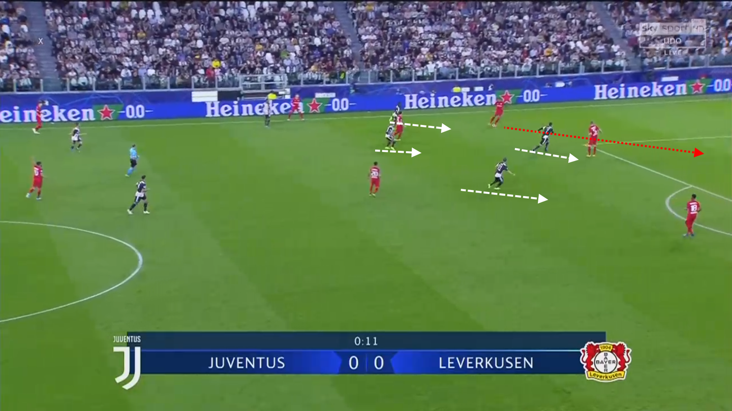 La Juventus sfrutta la grande densità di uomini in zona palla per forzare il retropassaggio e proseguire in avanti il pressing; mentre il Liverpool (in questo caso posizionato con un blocco difensivo medio-basso) costringe l'avversario a girarsi con la pressione di Firmino. Una volta riconosciuto il trigger, tutto il blocco accorcia in avanti.