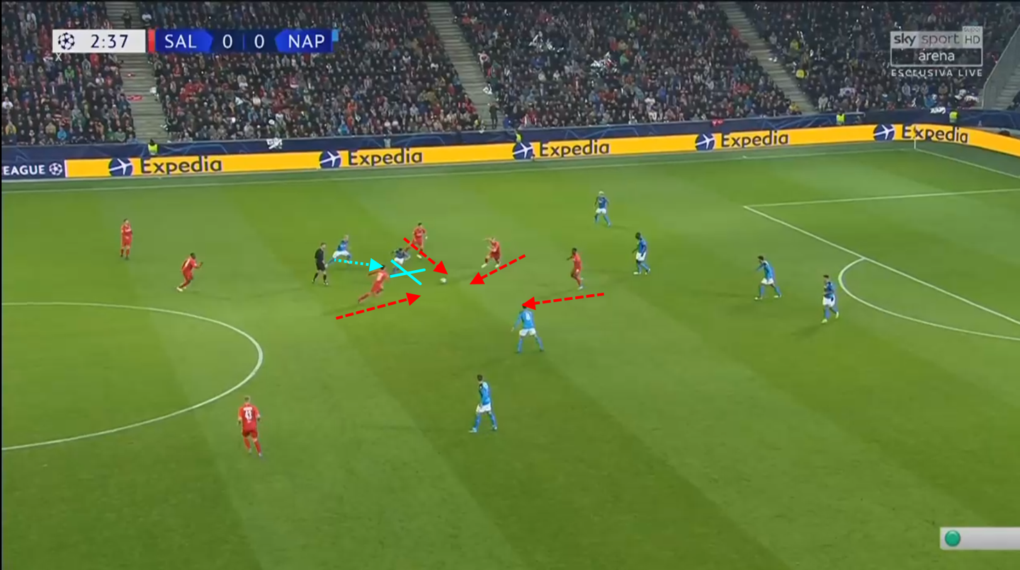 In questo caso, Callejon controlla male un rinvio difensivo, tagliando fuori anche Allan. Il Salisburgo reagisce immediatamente portando tutti gli uomini in zona palla in aggressione.
