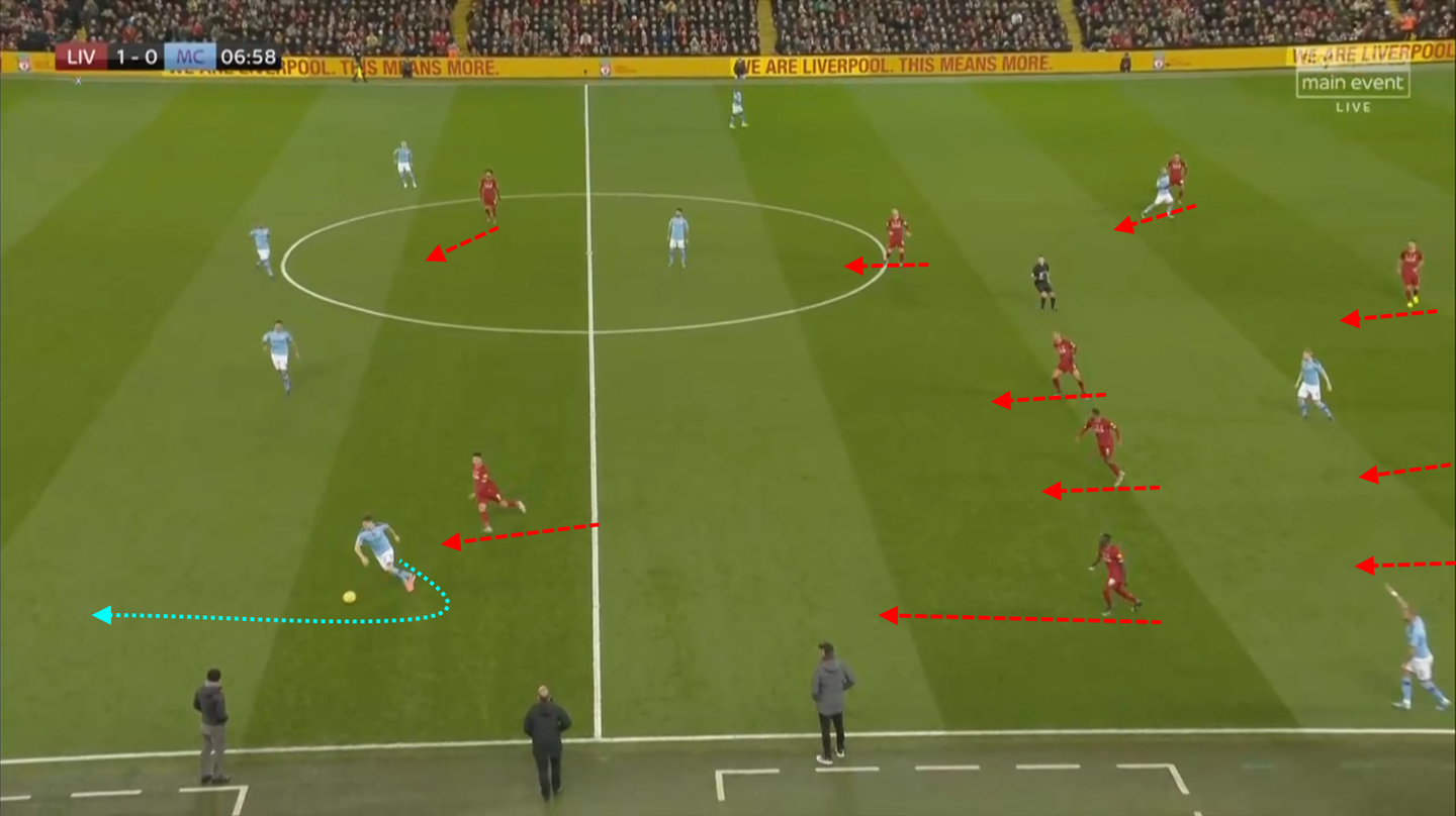 Liverpool, RB Salisburgo e Atalanta preferiscono invitare l’avversario a giocare verso il centro, per sfruttare densità e/o dinamismo individuale e collettivo per andare al recupero diretto (nella terza immagine un esempio di esca individuale, con Gomez che accorcia verso Gundogan solo dopo che il passaggio è partito).