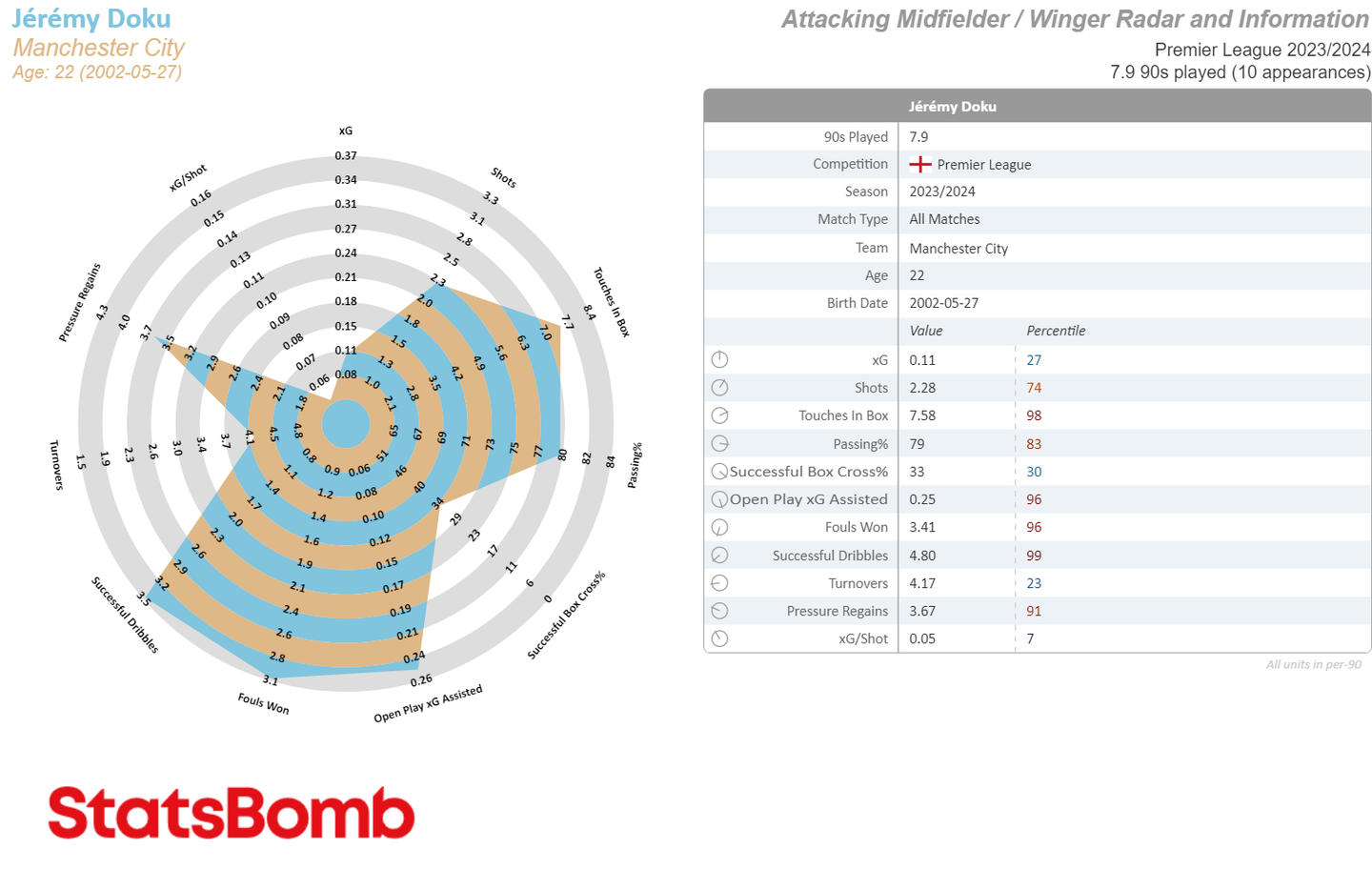 Confrontando i suoi ultimi dribbling con quelli delle giovanili si nota poi come Doku abbia asciugato il suo repertorio arrivando all'essenza del dribbling. Non è un caso che internet è pieno di video che evidenziano come Doku abbia una sola mossa (ma che quella mossa sia inarrestabile) e che per lui non sembra fare differenza giocare a destra o sinistra.