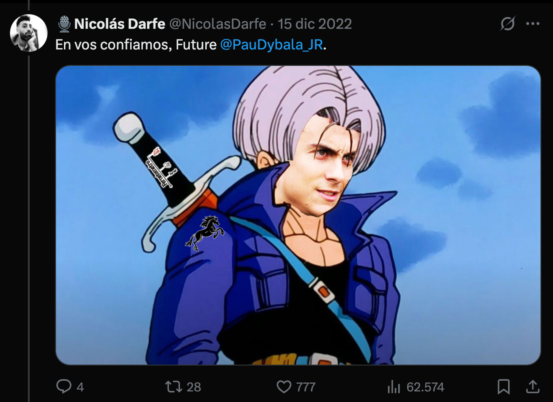Uno dei personaggi oggettivamente più fichi di Dragonball è Trunks, anzi la sua versione venuta dal futuro per cambiare la storia di Goku e compagni. Se vi andate a vedere la bio dell’utente Nicolas Darfe (ma perché dovreste? Ve la sintetizzo io) scoprite che oltre a essere un tifoso dell’Argentina e un docente universitario è anche un mega fan dell’opera di Akira Toriyama. Quindi ricapitolando: Vegeta è Lionel Scaloni (si assomigliano? Sì), Ian Scaloni è Trunks piccolo (Si assomigliano? Sì) e Paulo Dybala è Trunks dal futuro (Si assomigliano? Sì).