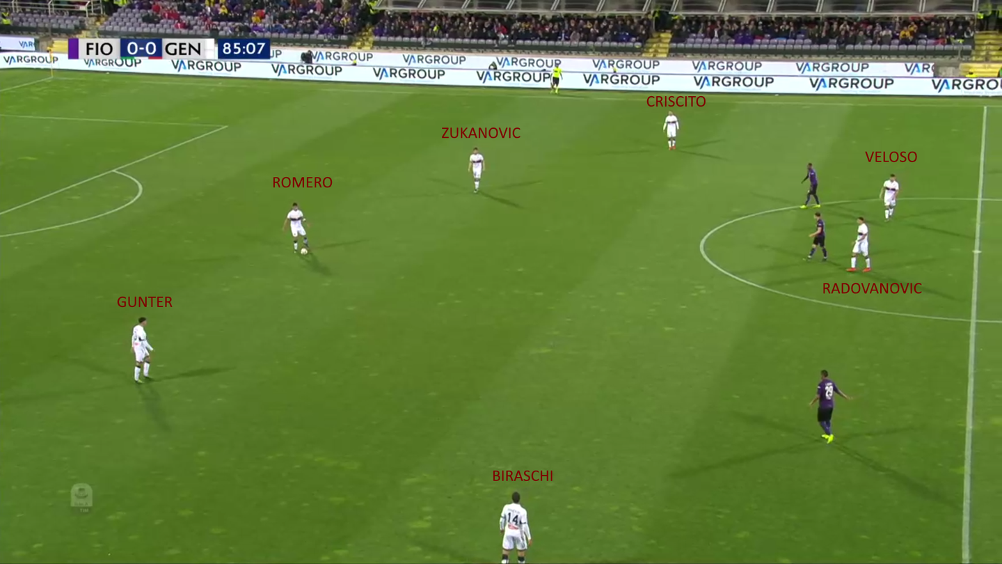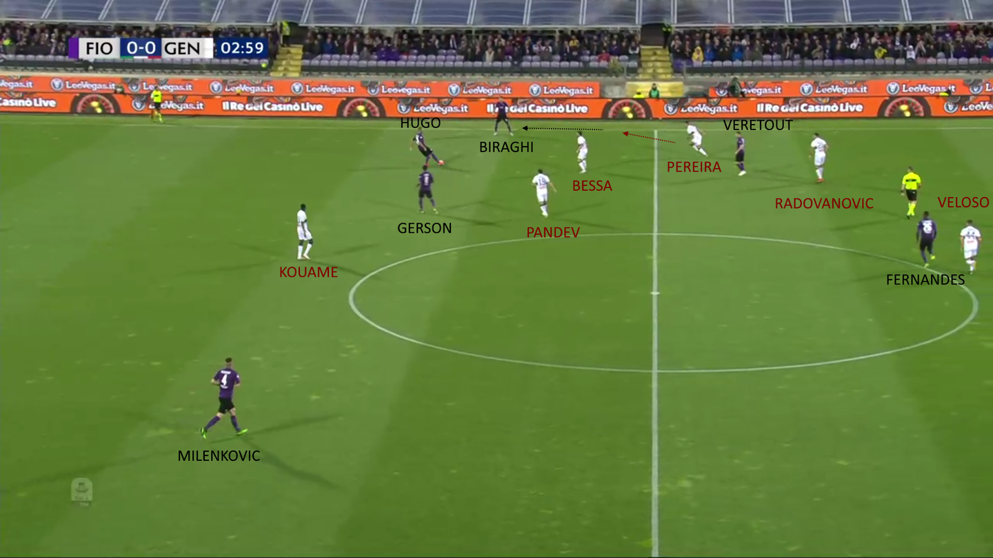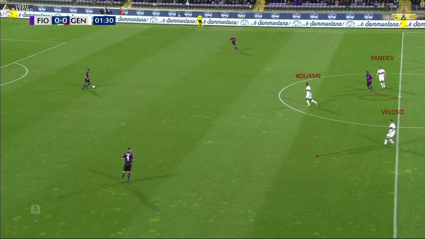 Il Genoa si è impegnata a bloccare Gerson utilizzando entrambe le punte: Kouame esercitava un pressing passivo per coprire la linea di passaggio, mentre Pandev seguiva il brasiliano quasi a uomo. Bessa e Veloso rimanevano dietro ai due, spostandosi lateralmente quando la palla giungeva al centrale difensivo (Milenkovic o Vitor Hugo), per coprire le verticalizzazioni verso il centro.