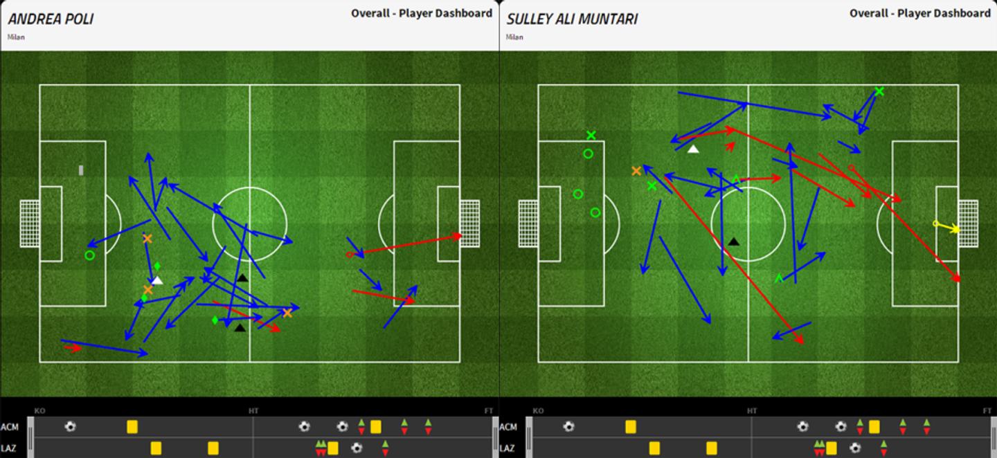 Dal punto di vista della distribuzione dei passaggi, sulla carta Poli è risultato più preciso nell’impostazione rispetto al collega di reparto (89% contro 73% al percentuale di passaggi completati per i milanisti). Muntari però ha giocato rischiando di più e tentando più passaggi in avanti, in particolare quando dalla fascia sinistra tentava di servire il movimento a uscire di Menez; bravo nell’occasione De Vrij ad intercettare molti di quelle assistenze.
