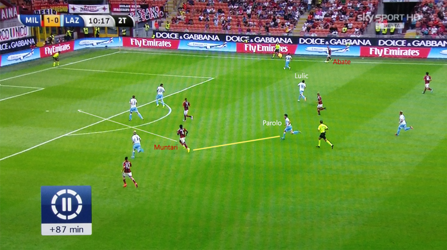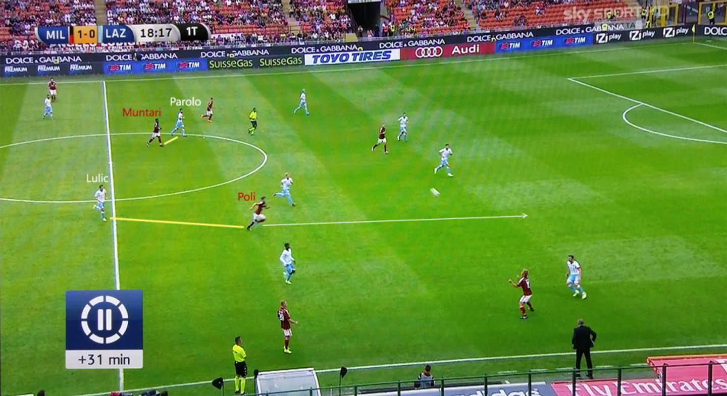 Ciò nonostante, Muntari è stato tra i due quello che si è fatto vedere più spesso nei pressi della trequarti avversaria, mentre cercava di sfruttare il movimento ad uscire di Menez. Il francese, numero nove di giornata a causa del forfait di Pazzini e del mancato transfer per Torres, si muoveva spalle alla porta cercando di trascinare uno dei due difensori centrali laziali fuori posizione. Il ghanese però non è riuscito a indovinare il tempo per il movimento nello spazio, anche a causa della marcatura di Parolo. Questo fino al decimo minuto del secondo tempo, quando l’azione che ha definitivamente rotto gli equilibri della partita ha coinvolto tutti e quattro i nostri protagonisti: Poli riceve palla in uscita dalla difesa e rompe la marcatura di Lulic, saltandolo e servendo Honda. Siamo nel cerchio di centrocampo, a cinquanta metri dalla porta di Berisha, ma Muntari intravede un’opportunità e si lancia a supporto del contropiede, scappando alle spalle di Parolo.