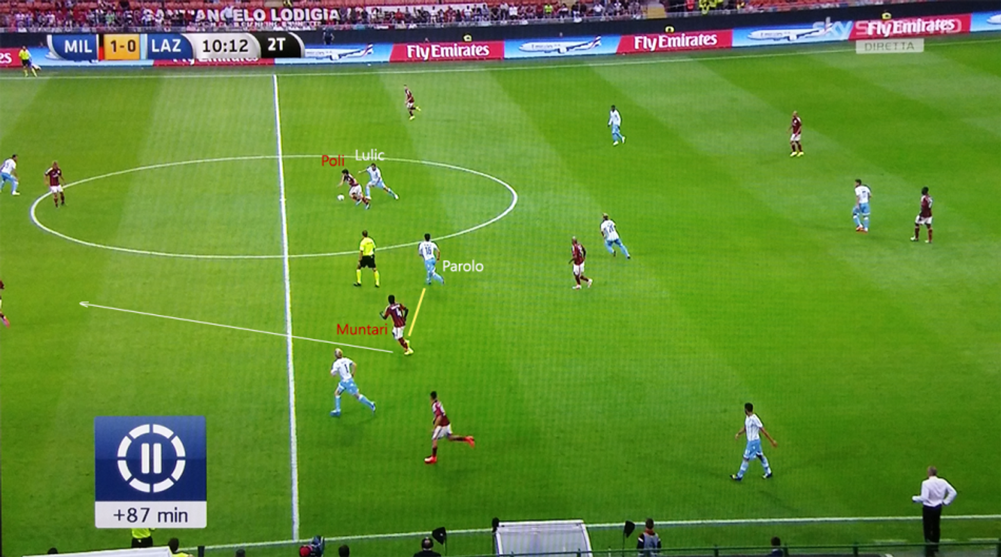 Sulla carta, quella formata da Poli e Muntari è una coppia più muscolare, meno talentuosa rispetto agli omologhi laziali. Ma proprio la prestanza fisica permette loro di essere più adatti al sistema pensato da Inzaghi. Il Milan difende basso, tenendo la linea dei quattro difensori sui sedici metri e quella dei tre centrocampisti non più lontano di quindici metri. Una volta riconquistata palla, i rossoneri provano a cercare gli esterni offensivi, El Shaarawy ed Honda, che con la loro velocità hanno permesso di ribaltare il fronte efficacemente. Uno dei due interni, a turno, seguiva lo svolgimento della manovra pur costretto a coprire i settanta metri che separano le due aree di rigore. Poli si è reso pericoloso trovando più di una volta lo spazio alle spalle di Radu: il terzino sinistro laziale usciva sull’esterno per andare a marcare Keisuke Honda, mentre il compagno Cana restava sempre troppo stretto, forse per paura di lasciare Menez uno contro uno con De Vrij.