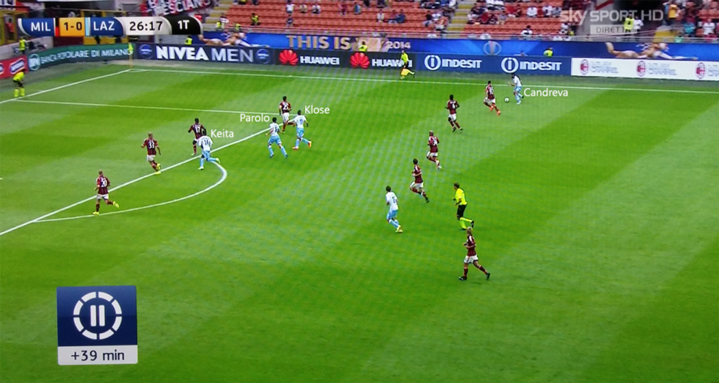 Miroslav Klose è il tipico centravanti d’area che sgomita tra i centrali difensivi avversari, partecipando poco alla manovra della propria squadra. Spesso gli inserimenti di Parolo sono stati inefficaci perché la zona che andava ad attaccare era già presidiata dal compagno e dagli avversari in marcatura su di lui. Inoltre una mancata copertura su uno sganciamento dell’ex parmense ha permesso al Milan di andare in vantaggio: quando parte il contropiede Basta e Candreva si trovavano entrambi in posizione di ala, mentre Parolo era in area per saltare sul cross di Radu. Parolo si è reso pericoloso ricevendo palla davanti alla difesa e dialogando nello stretto con Keita e Klose, specie nel secondo tempo quando la stanchezza tra i milanisti affiorava e le loro maglie si sono allenatate. Il neo laziale si è speso anche in fase d’impostazione, venendo basso ad aiutare la squadra all’inizio della manovra: la linea di passaggio tra Biglia e Parolo è stata tra le più battute della partita biancoceleste con 22 passaggi totali.