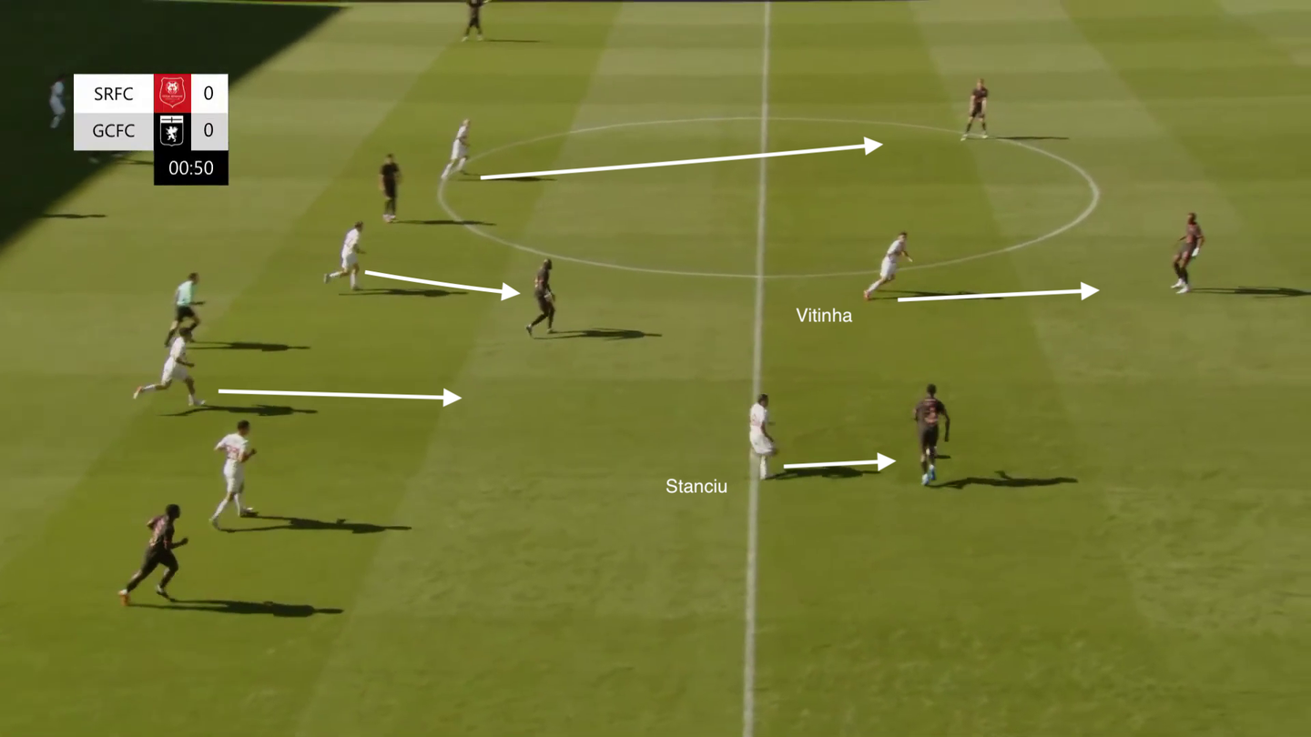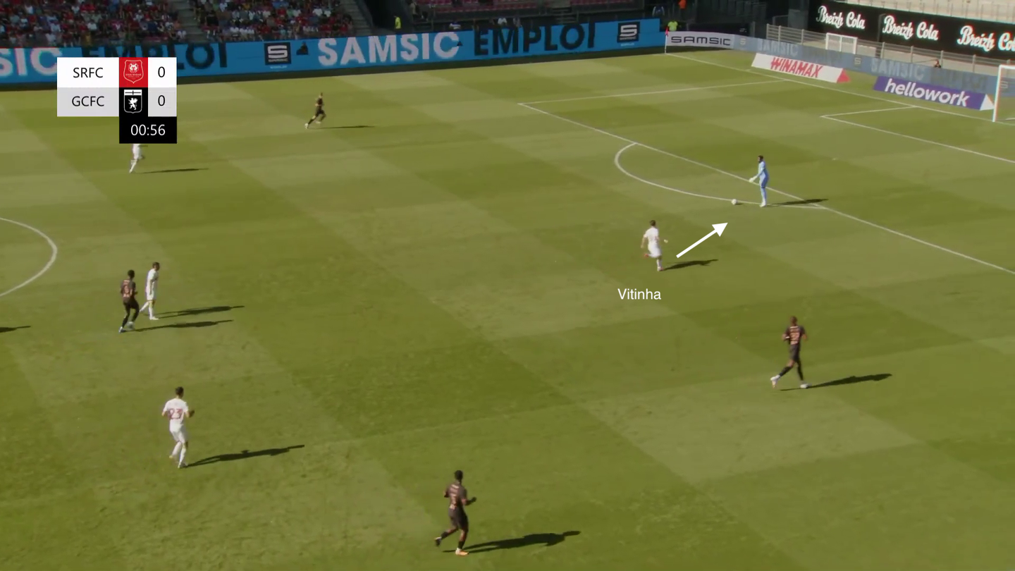 Il pressing del Genoa non ha precisi riferimenti a uomo: qui su un retropassaggio forzato da Carboni, partono tutti in avanti, aggredendo chiunque ha il pallone (nella terza immagine Vitinha va forte sul portiere) anche se le distanze sono ampie (vedi Martin che costringe al lancio il laterale avversario coprendo quasi 20 metri di campo in scatto).