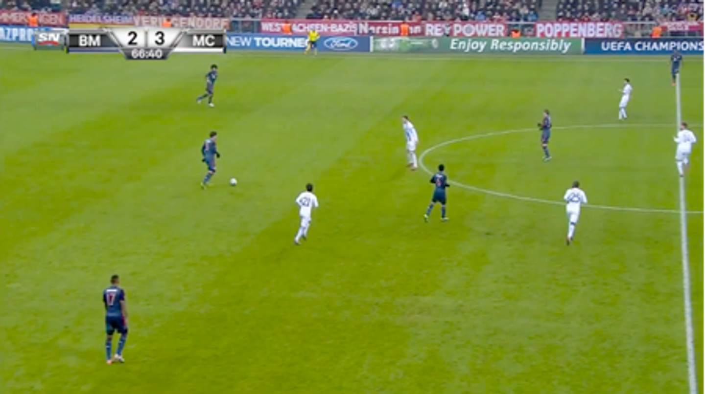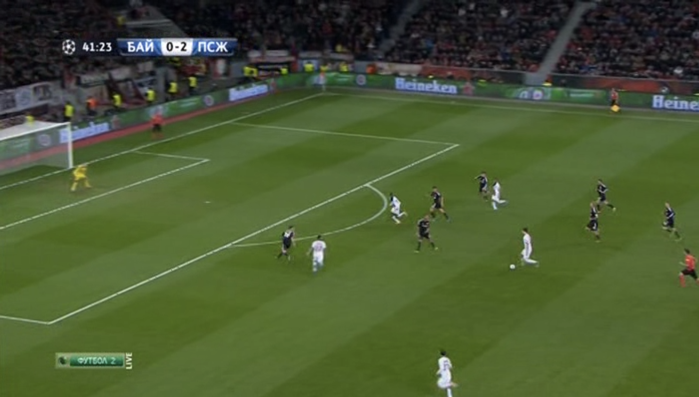 Questa è l'azione che porterà al secondo gol contro il Leverkusen, all'andata in Germania (risultato finale 0-4). Quello al centro dell'attacco è Matuidi. L'azione proseguirà con Ibrahimović che scarica sul fianco sinistro, Maxwell che crossa con Matuidi a centro area e Ibrahimović che su respinta della difesa decide di fare una cosa delle sue.