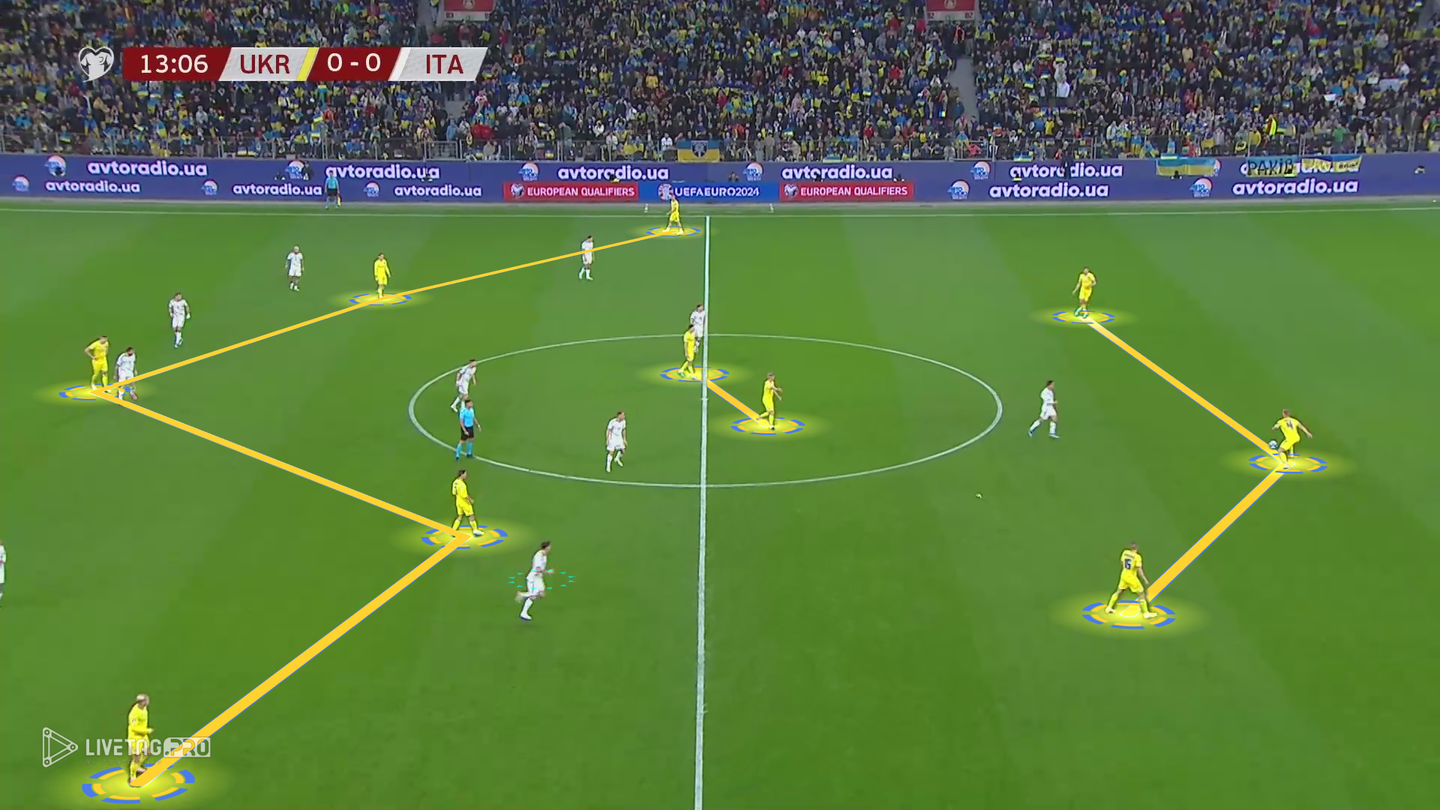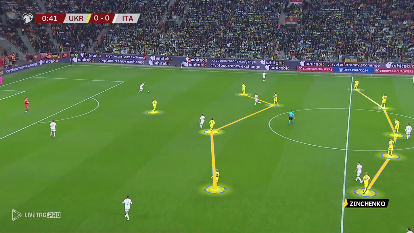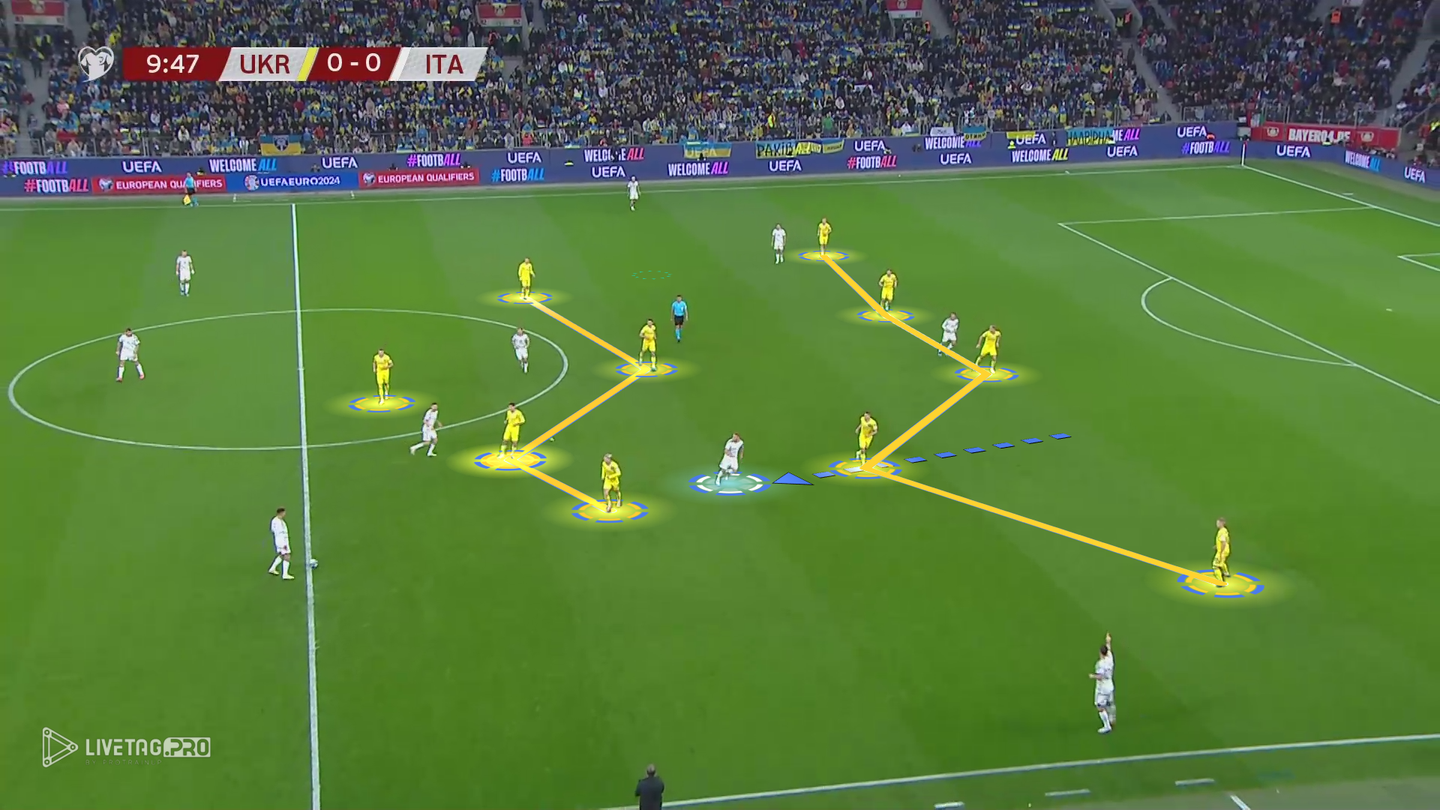 La costruzione a 3 è una costante che però viene trovata in maniera a diversa a seconda degli interpreti in campo: nella gara decisiva contro l’Islanda mancava Zinchenko dal primo minuto, ed è stato il movimento del vertice basso Brazkho ad abbassarsi tra i due centrali a permettere di ricreare quella struttura, con i due terzini che potevano alzarsi in ampiezza lasciando l’occupazione dei mezzi spazi agli esterni alti.