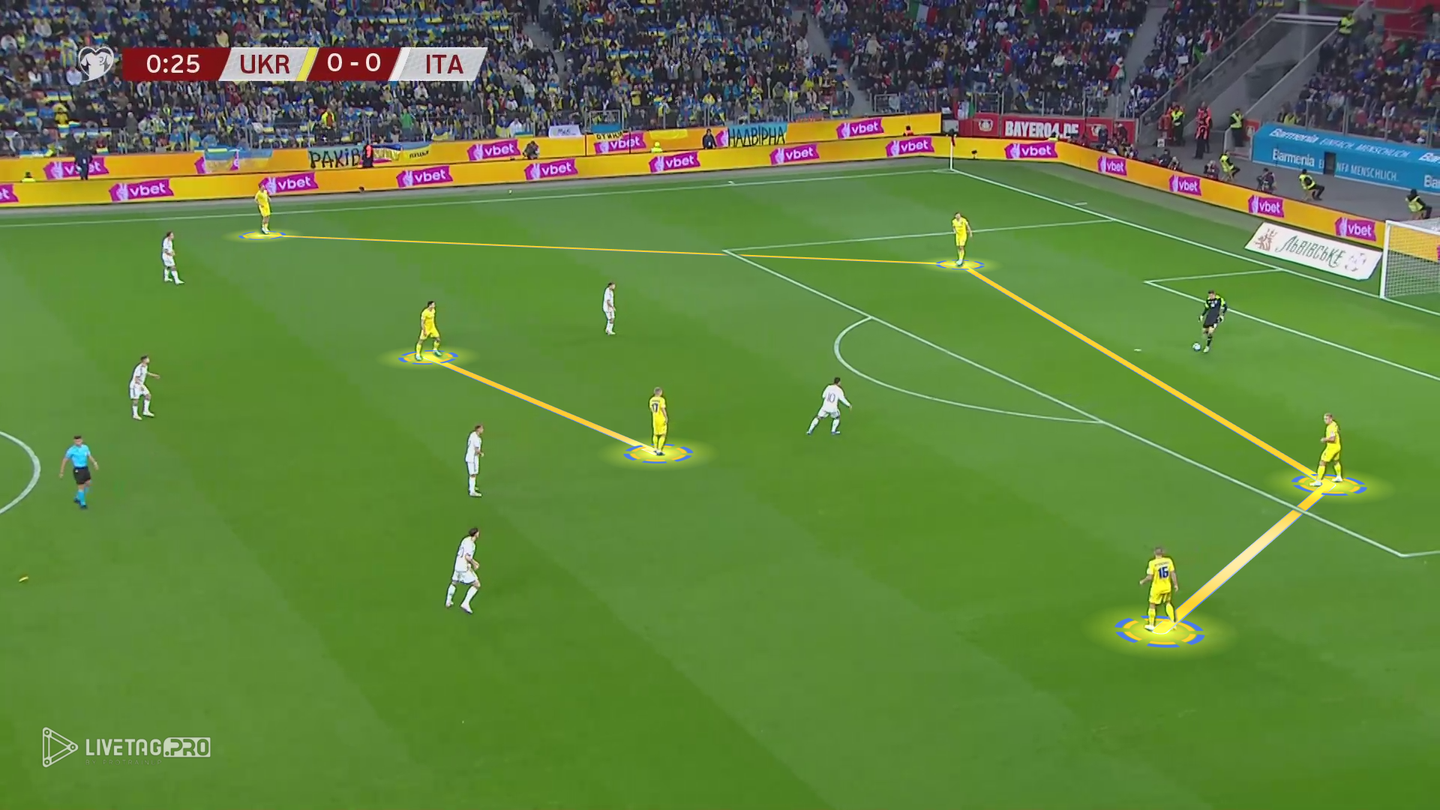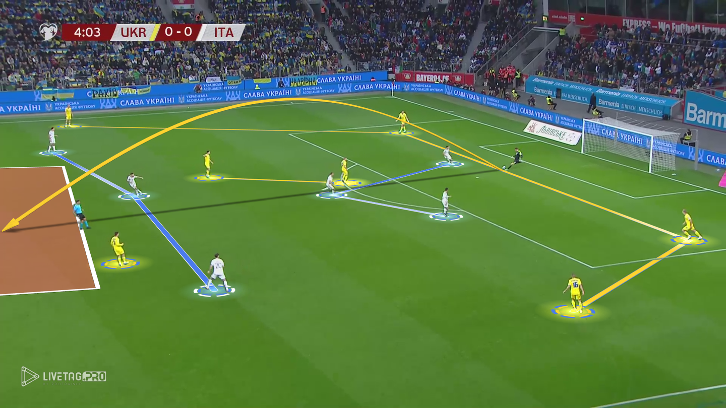 In fase di non possesso l’atteggiamento non è particolarmente aggressivo: viene lasciata la prima costruzione agli avversari, come dimostra il dato piuttosto alto sul PPDA. L’aspetto più interessante è però il radicale cambio di assetto tattico: Rebrov infatti opta per un 5-4-1 sia nel tratto alto che nel tratto medio abbassando Zinchenko nella posizione di terzino sinistro, oppure abbassando il vertice basso tra i due centrali. Prendendo in esame la gara giocata contro l’Italia che costruiva 4+2, l’idea era quella di lasciare il centravanti a ballare tra i due centrali con l’intento di chiudere la linea verso il compagno di reparto per forzarlo sull’esterno, mentre la linea a 4 di centrocampo prendeva a uomo il proprio riferimento con i due esterni alti sui terzini azzurri e i due centrocampisti sul doppio play.